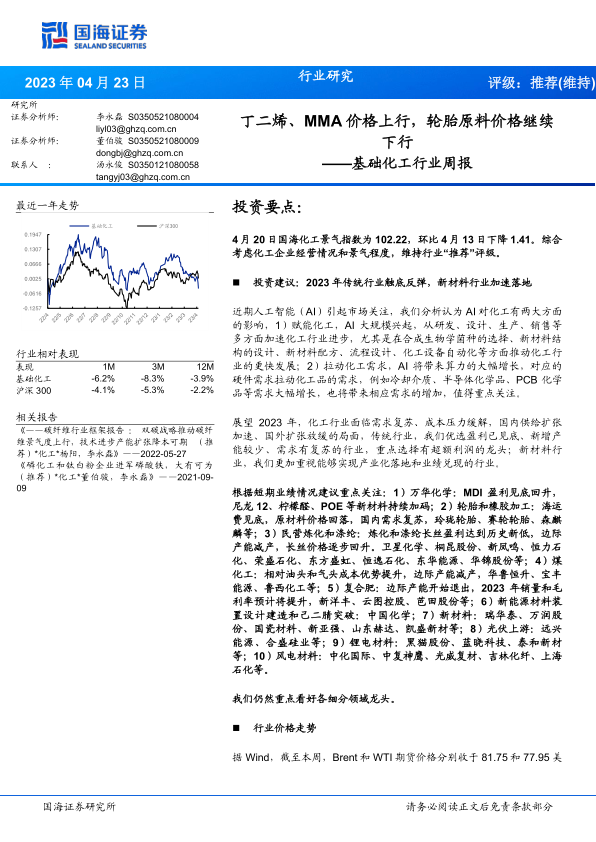 报告对多家重点化工企业进行了深入跟踪,包括万华化学、玲珑轮胎、赛轮轮胎、森麒麟、恒力石化、荣盛石化、东方盛虹、恒逸石化、卫星化学、桐昆股份、新凤鸣、新洋丰、云图控股、中国化学、阳谷华泰、双箭股份、华峰化学、新和成、三友化工、华鲁恒升、宝丰能源、瑞华泰、金禾实业、赞宇科技、国瓷材料、扬农化工、利尔化学、国光股份、长青股份、海利尔、三棵树、金发科技、道恩股份、万润股份、利安隆、山东赫达、新亚强、凯盛新材、雅克科技、江化微、蓝晓科技、盐湖股份、粤桂股份、中化国际、齐翔腾达等。 对于每家公司,报告都总结了其近期业绩表现、重大公告、发展战略以及未来展望,并结合市场行情进行分析。 报告还提供了这些公司的股票代码、股价、市值、PE、PB等关键财务指标,以及2021年、2022年和2023年的EPS预测。