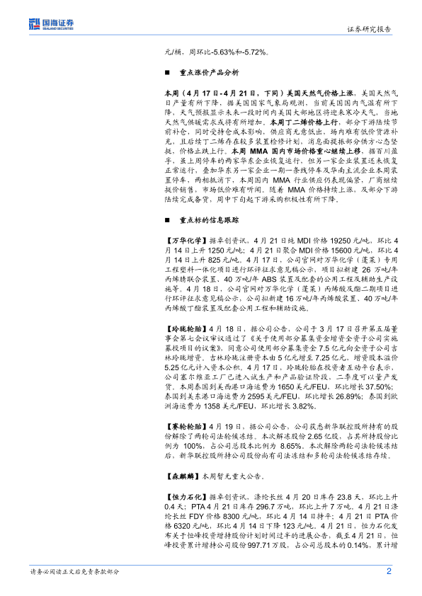 【万华化学】据卓创资讯,4月21日纯MDI价格19250元/吨,环比4月14日上升1250元/吨;4月21日聚合MDI价格15600元/吨,环比4月14日上升825元/吨。4月17日,公司官网对万华化学(蓬莱)专用工程塑料一体化项目进行环评征求意见稿公示,项目拟新建26万吨/年丙烯腈联合装置、40万吨/年ABS装置及配套的公用工程及辅助生产设施等。4月18日,公司官网对万华化学(蓬莱)丙烯酸及酯二期项目进行环评征求意见稿公示,公司拟新建16万吨/年丙烯酸装置、40万吨/年丙烯酸丁酯装置及配套公用工程和辅助设施。