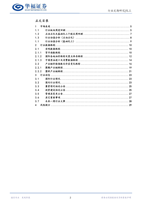 报告总结了近期重要的行业动态,包括国际和国内的行业政策、企业投资建设、融资情况以及管理层变动等信息。 最后,报告对化工行业未来的发展趋势进行了展望,建议投资者关注能源安全、中下游盈利扩张以及新材料等领域,并提示了产品价格波动、安全环保以及项目进度不及预期等风险。