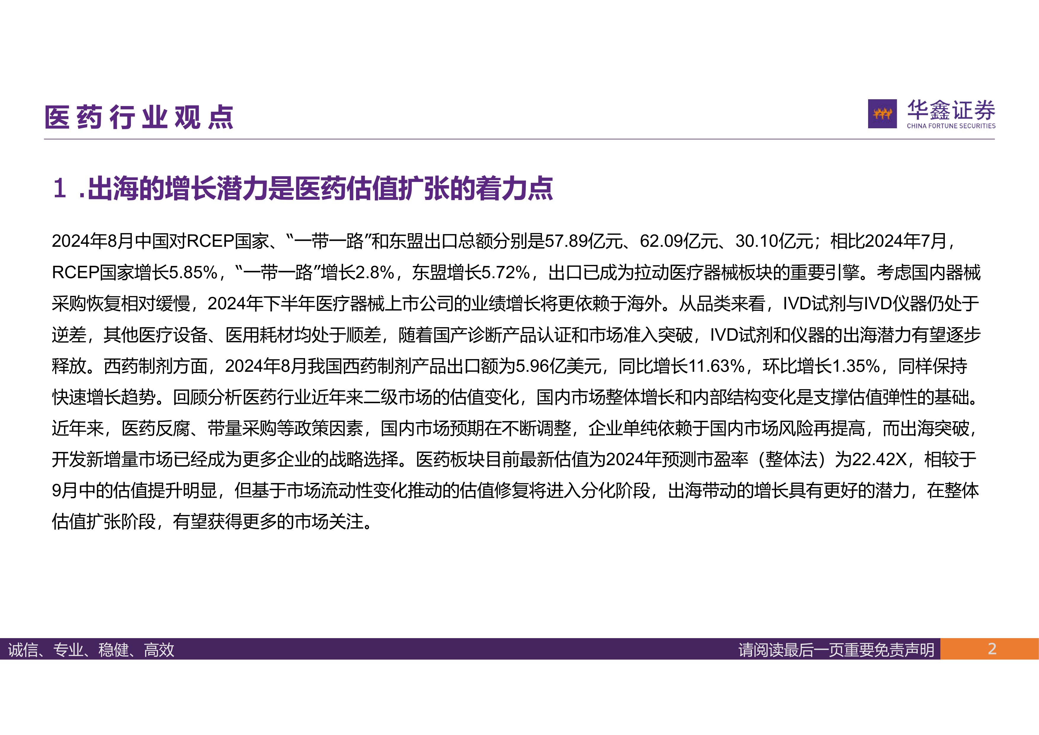 2024年8月中国对RCEP国家、“一带一路”和东盟出口总额分别是57.89亿元、62.09亿元、30.10亿元;相比2024年7月,RCEP国家增长5.85%,“一带一路”增长2.8%,东盟增长5.72%,出口已成为拉动医疗器械板块的重要引擎。考虑国内器械采购恢复相对缓慢,2024年下半年医疗器械上市公司的业绩增长将更依赖于海外。从品类来看,IVD试剂与IVD仪器仍处于逆差,其他医疗设备、医用耗材均处于顺差,随着国产诊断产品认证和市场准入突破,IVD试剂和仪器的出海潜力有望逐步释放。西药制剂方面,2024年8月我国西药制剂产品出口额为5.96亿美元,同比增长11.63%,环比增长1.35%,同样保持快速增长趋势。回顾分析医药行业近年来二级市场的估值变化,国内市场整体增长和内部结构变化是支撑估值弹性的基础。近年来,医药反腐、带量采购等政策因素,国内市场预期在不断调整,企业单纯依赖于国内市场风险再提高,而出海突破,开发新增量市场已经成为更多企业的战略选择。医药板块目前最新估值为2024年预测市盈率(整体法)为22.42X,相较于9月中的估值提升明显,但基于市场流动性变化推动的估值修复将进入分化阶段,出海带动的增长具有更好的潜力,在整体估值扩张阶段,有望获得更多的市场关注。