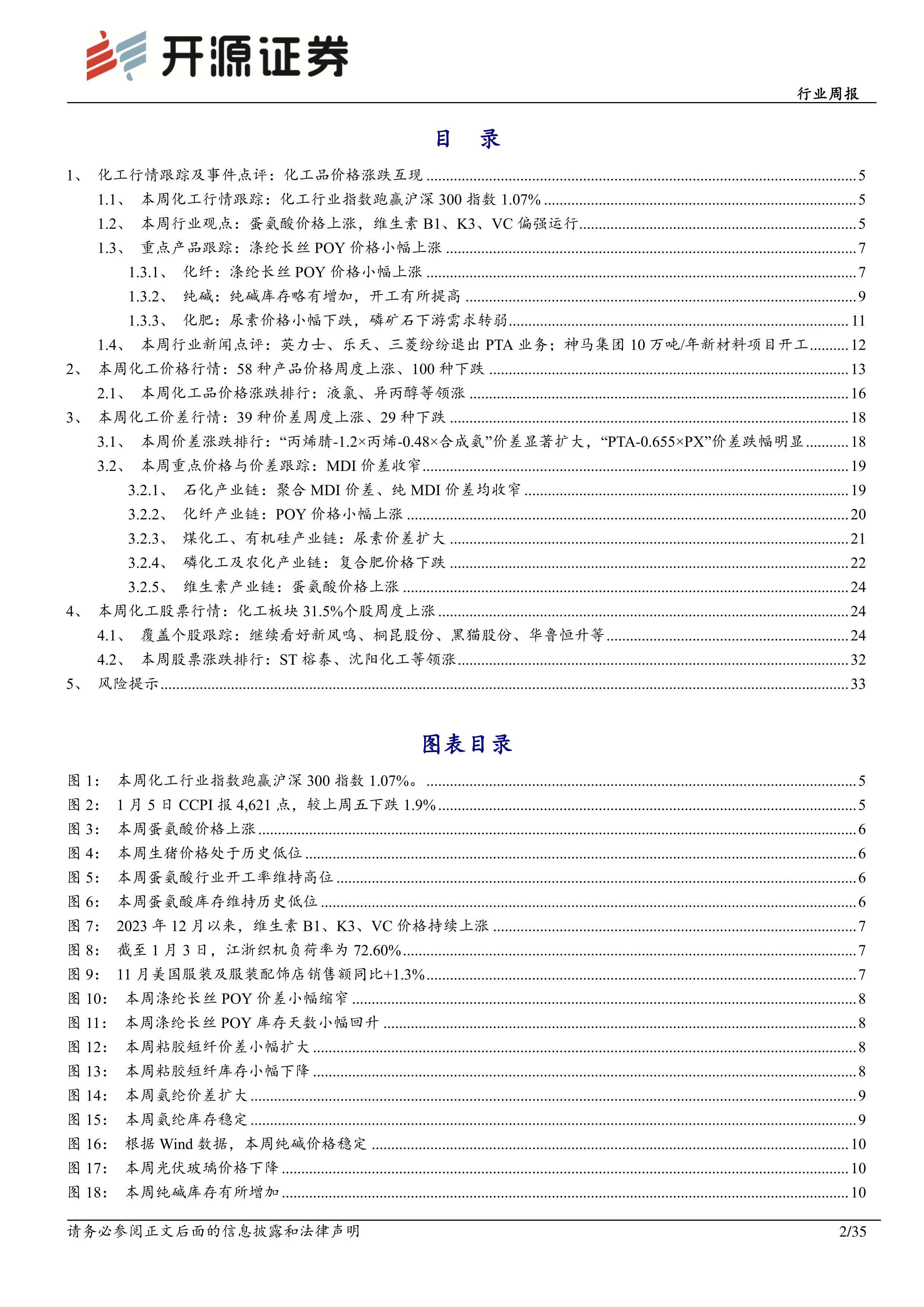 本部分首先对本周化工行业指数、CCPI指数以及化工板块个股的涨跌情况进行了跟踪,指出化工行业指数跑赢沪深300指数1.07%。随后,报告重点分析了蛋氨酸和维生素B1、K3、VC价格上涨的原因以及受益标的,并对涤纶长丝、纯碱、化肥等重点产品的价格走势和库存情况进行了跟踪分析。最后,报告对英力士、乐天、三菱化学退出PTA业务以及神马集团新材料项目开工等行业新闻进行了点评,并分析了这些事件对行业格局的影响。