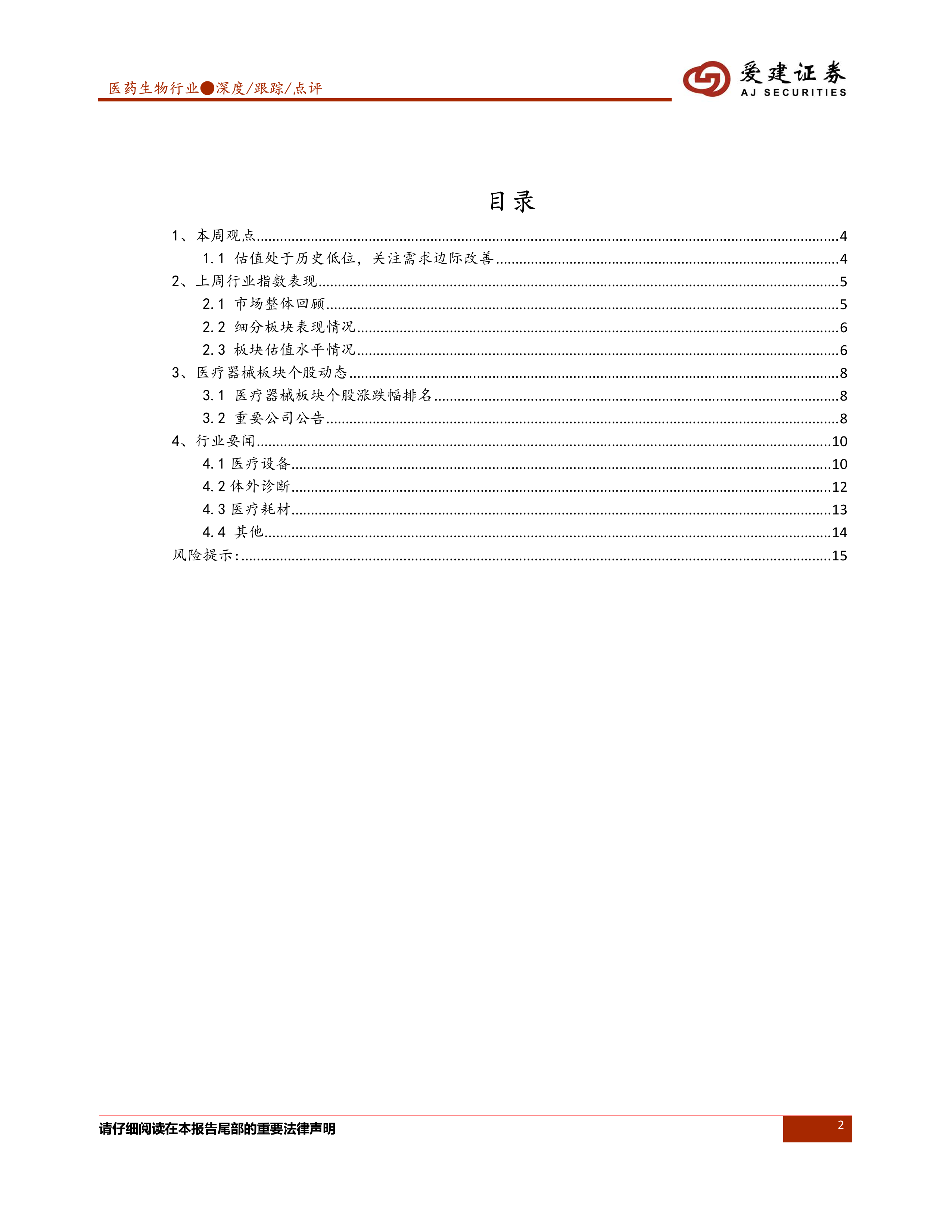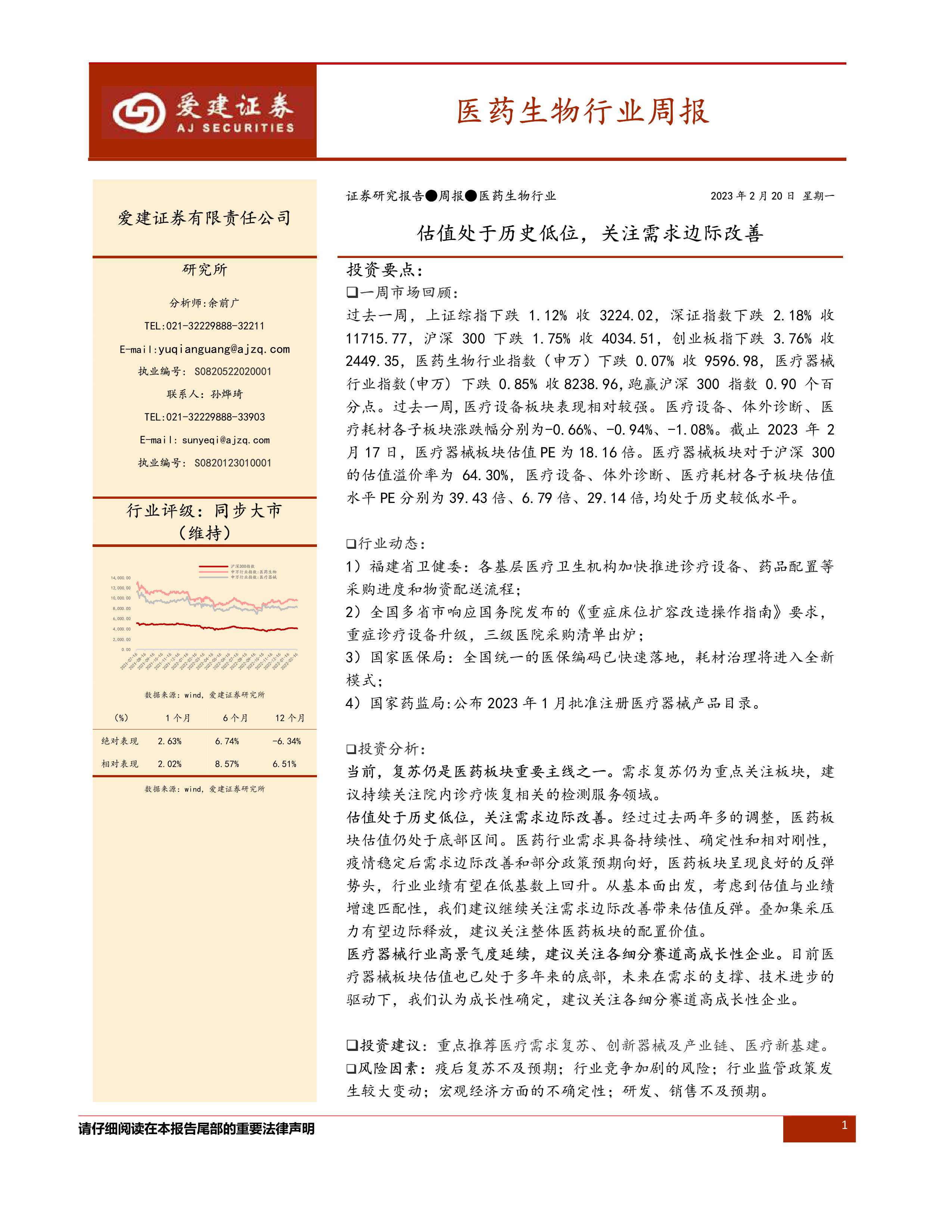 本报告基于对市场数据的分析,认为医药生物行业,特别是医疗器械板块,当前估值处于历史低位,具备良好的投资价值。需求复苏是医药板块的重要投资主线,建议关注院内诊疗恢复相关的检测服务领域以及医疗器械行业的高成长性企业。 同时,报告也指出,利好政策环境、创新器械发展以及产业链自主可控等因素将进一步推动行业发展。 然而,投资者也需关注疫后复苏不及预期、行业竞争加剧、监管政策变动、宏观经济不确定性以及研发和销售不及预期等风险因素。