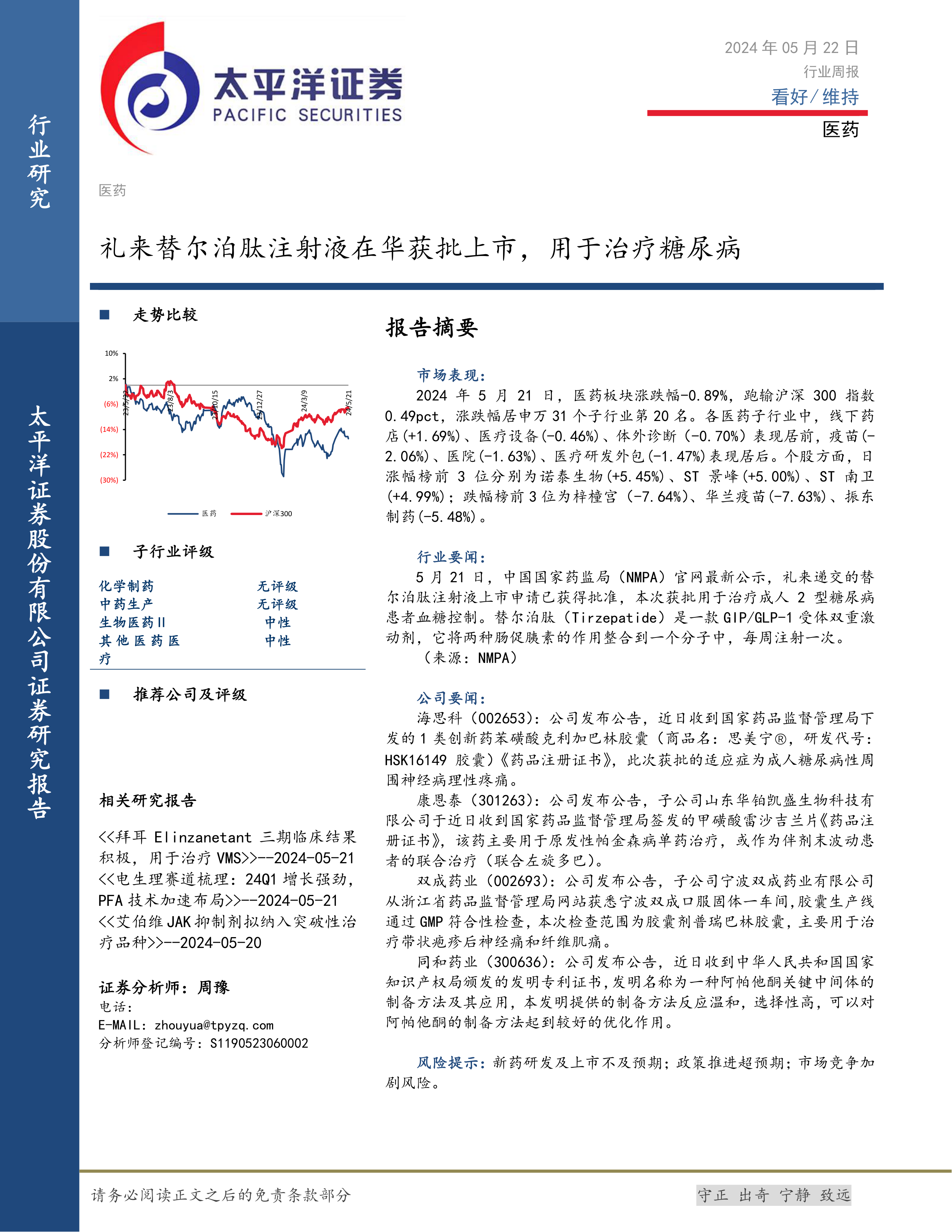 本周医药行业整体表现平稳,但个股涨跌分化明显。礼来替尔泊肽注射液的获批上市是行业利好消息,但市场仍存在一定风险。投资者需关注个股的基本面和市场风险,谨慎投资。未来六个月,医药行业整体评级为中性。 报告中提到的多家公司在研发和生产方面取得了进展,这预示着医药行业持续发展的潜力。然而,新药研发的不确定性以及市场竞争的加剧仍然是需要关注的重要因素。 投资者应密切关注政策变化、市场动态以及公司自身发展情况,做出理性投资决策。