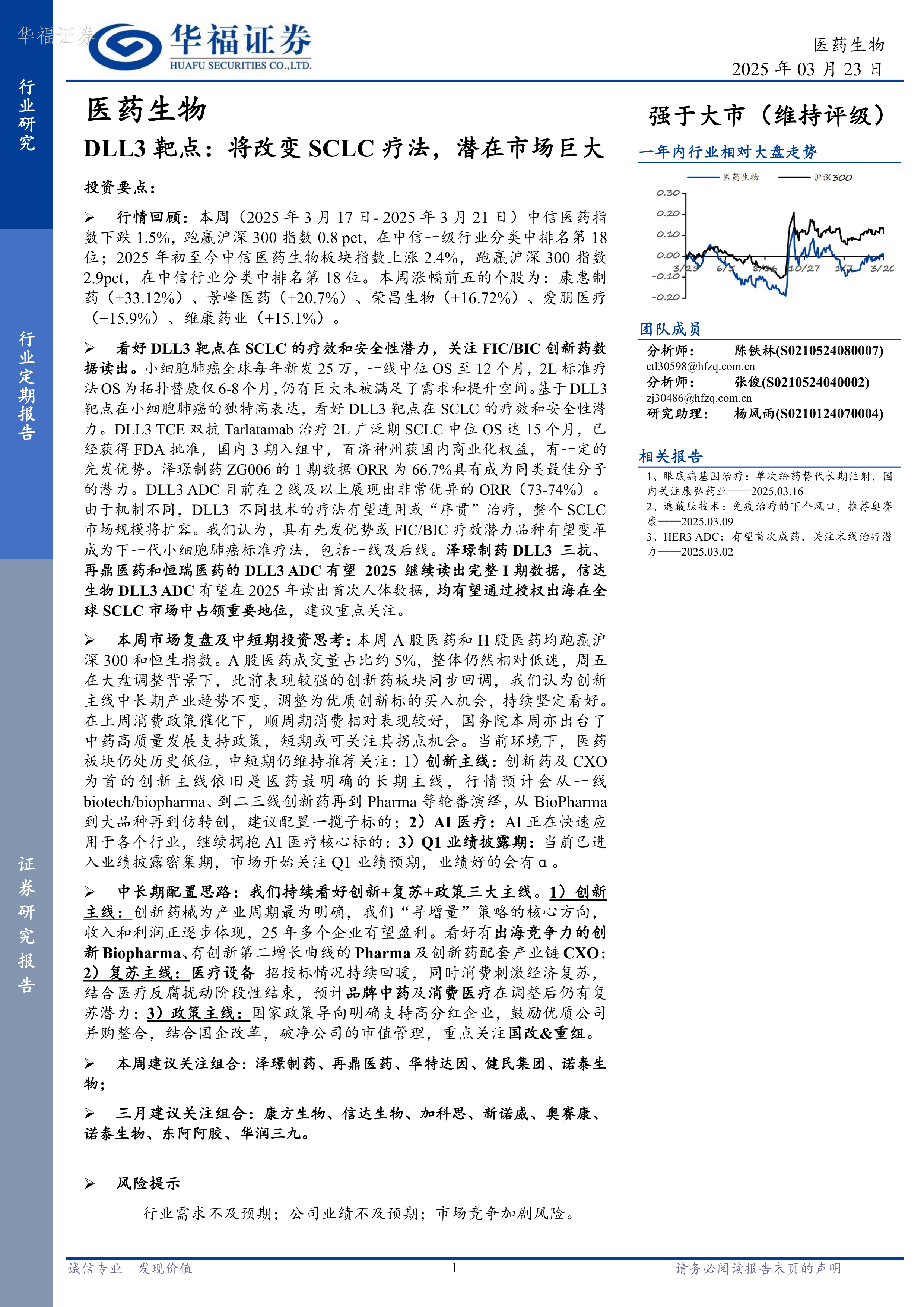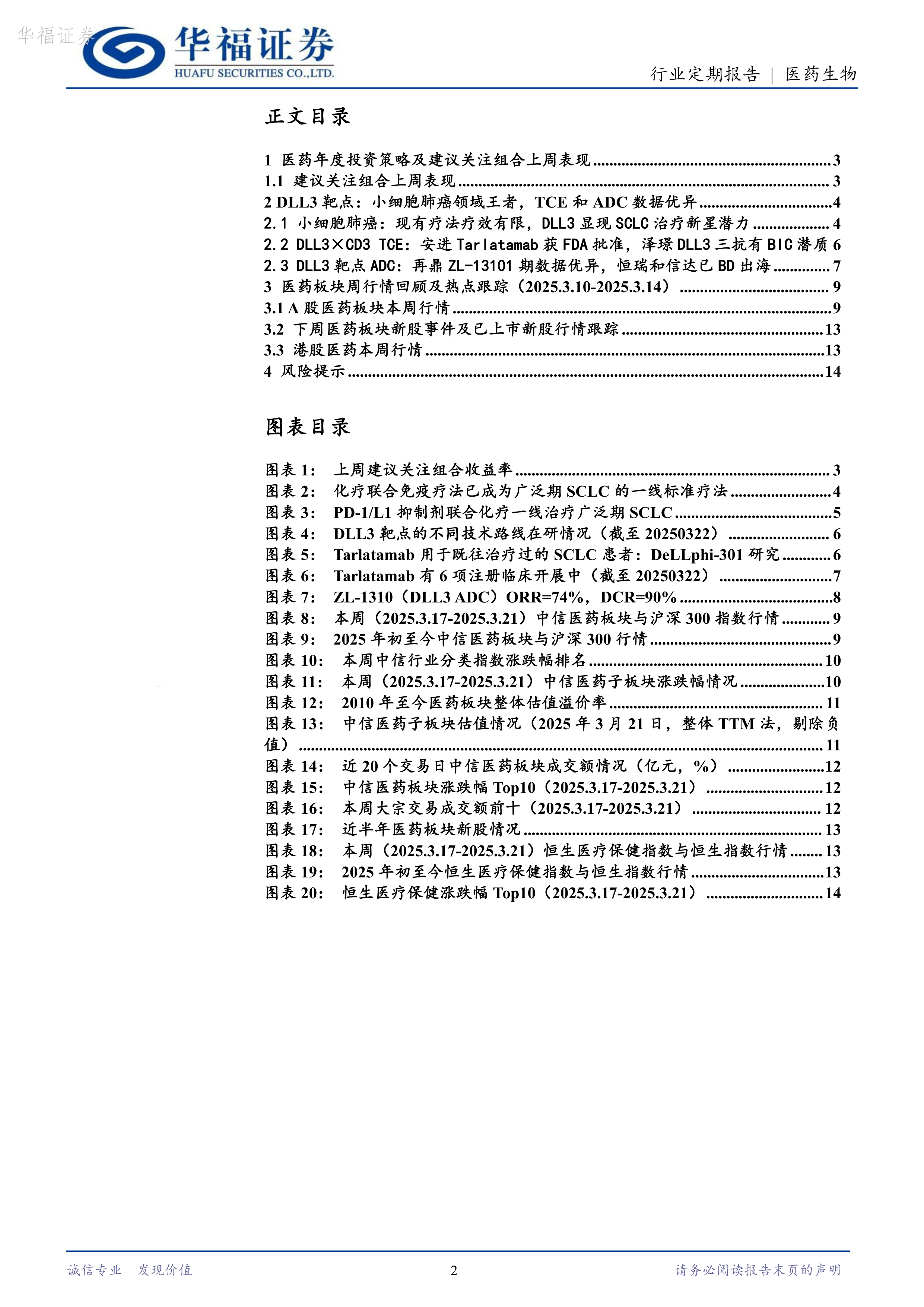 本报告的核心观点是:DLL3靶点在小细胞肺癌(SCLC)治疗领域展现出巨大潜力,其不同技术路线的疗法(TCE和ADC)均取得了显著疗效,有望改变SCLC的治疗格局,潜在市场巨大。同时,报告分析了2025年3月17日至21日A股和H股医药市场行情,并对未来中长期投资策略进行了展望,建议关注创新药、AI医疗和业绩优良的医药公司。