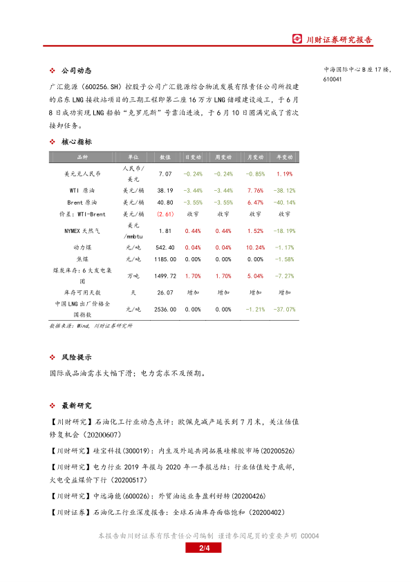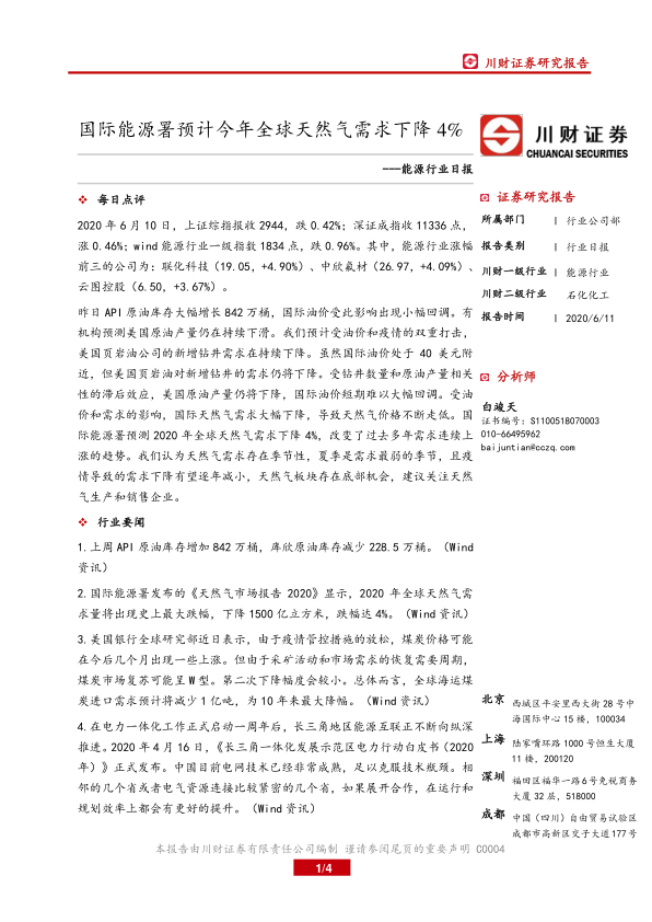 本报告基于国际能源署对全球天然气需求下降的预测,分析了当前能源市场,特别是天然气和原油市场的现状及未来走势。报告指出,尽管疫情和油价下跌对能源市场造成冲击,但天然气板块存在底部机会,建议关注天然气生产和销售企业。此外,报告还对原油库存、煤炭市场、电力一体化等行业动态进行了分析,并提供了相关公司和行业的最新研究报告。 投资者需注意报告中提到的风险提示,并结合自身情况进行投资决策。 本报告仅供参考,不构成投资建议。