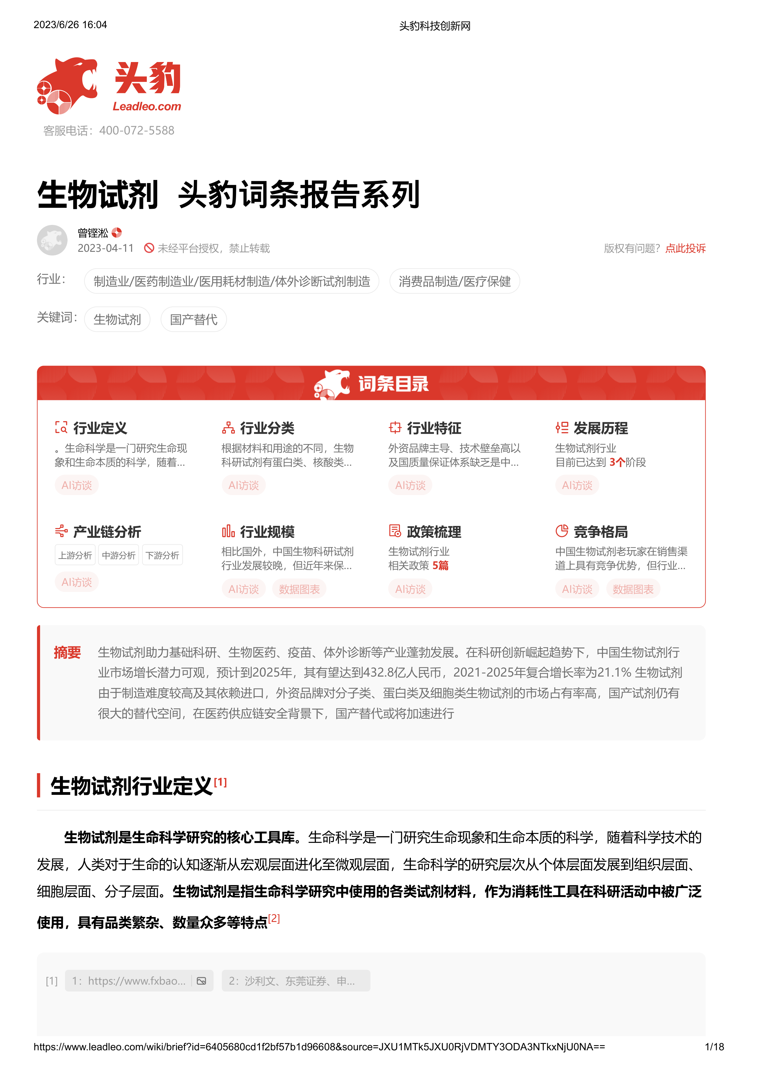 本报告基于头豹科技创新网提供的生物试剂行业报告数据,对中国生物试剂市场进行分析。核心观点如下: