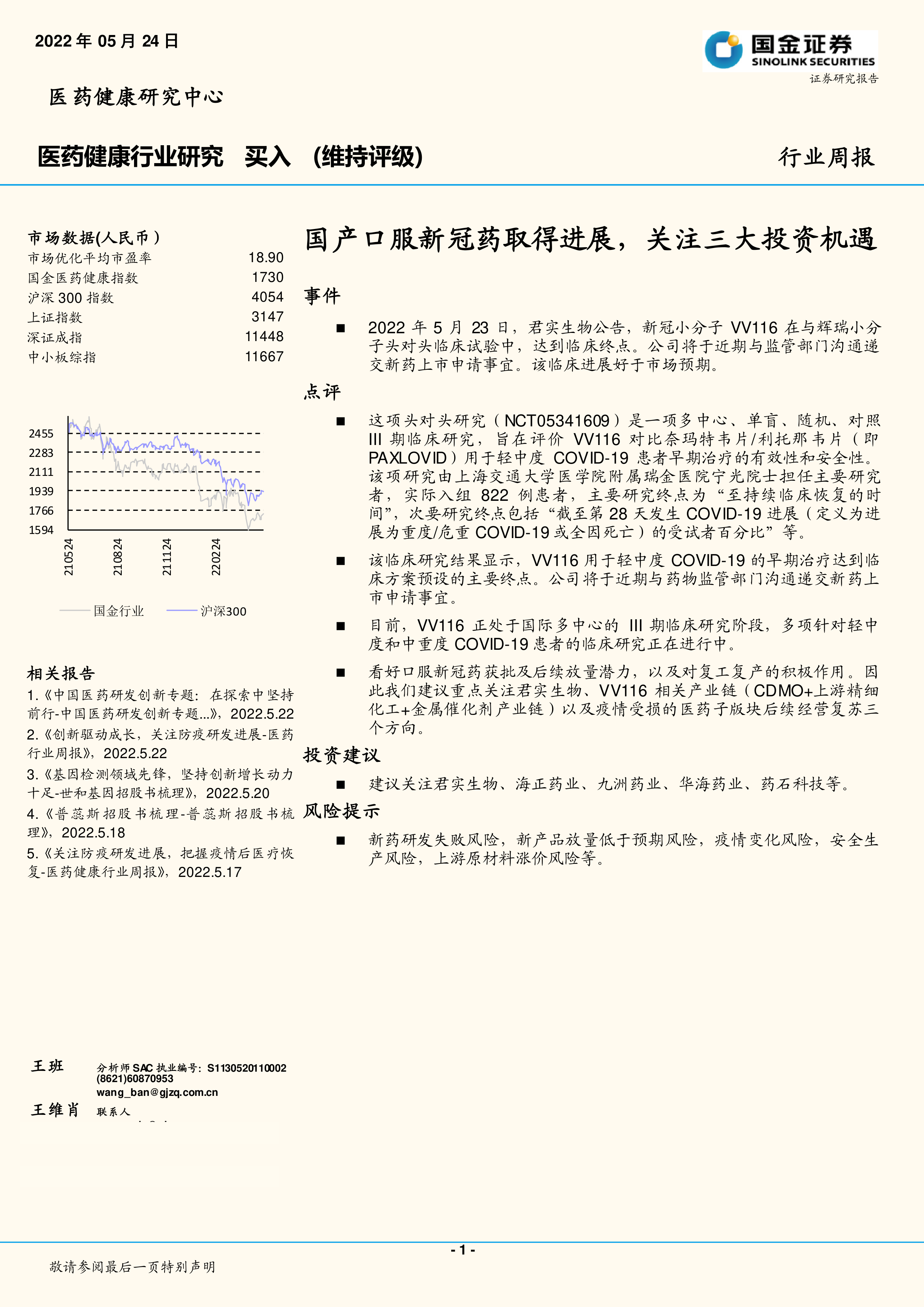 本报告是一份医药健康行业周报,重点关注国产口服新冠药物的研发进展及其对市场的影响。报告基于君实生物VV116临床试验成功的消息,对医药行业进行了分析,并提出了相应的投资建议。