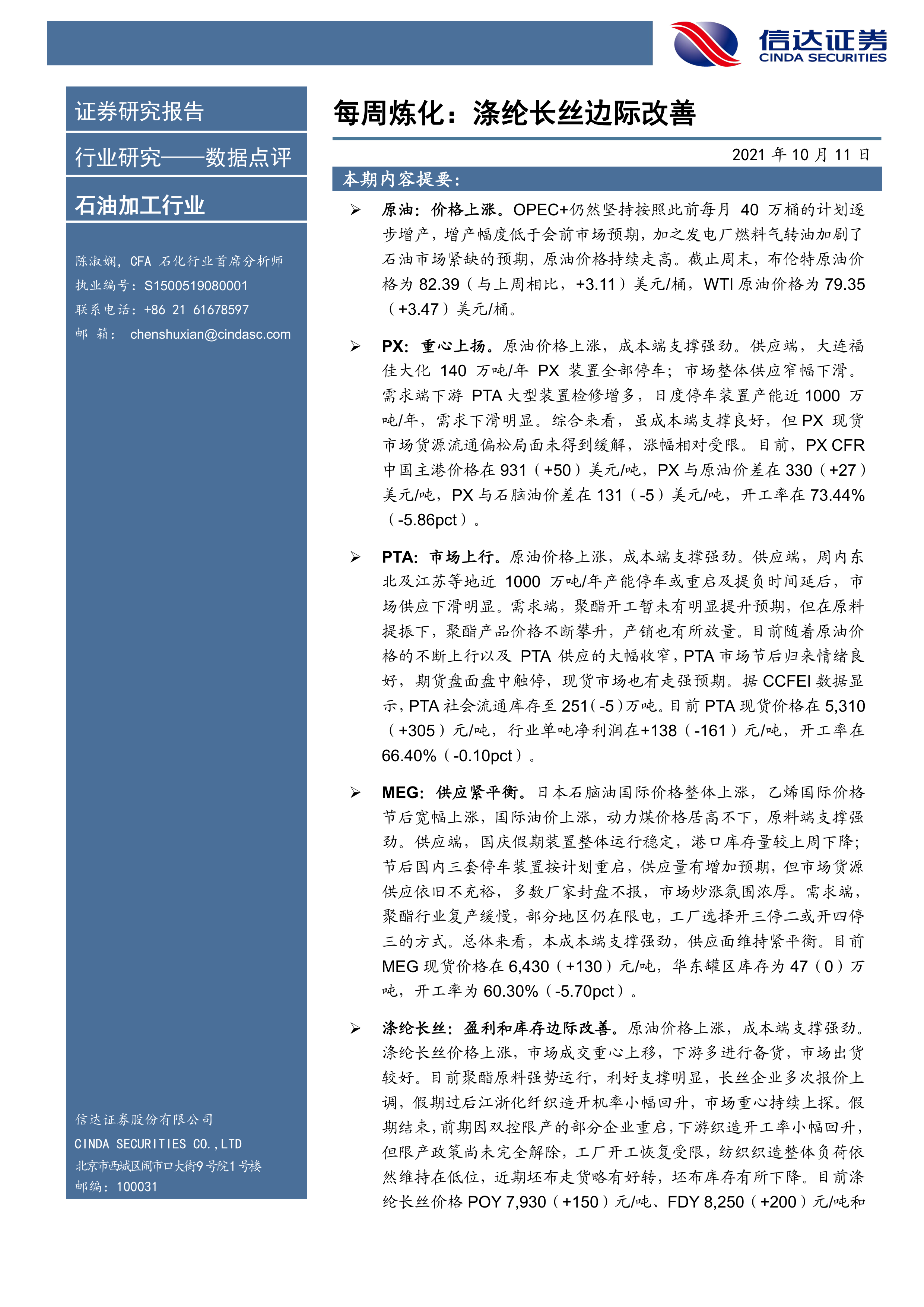 本报告以数据为基础,对石油化工行业,特别是涤纶长丝产业链的市场行情进行了详细分析。