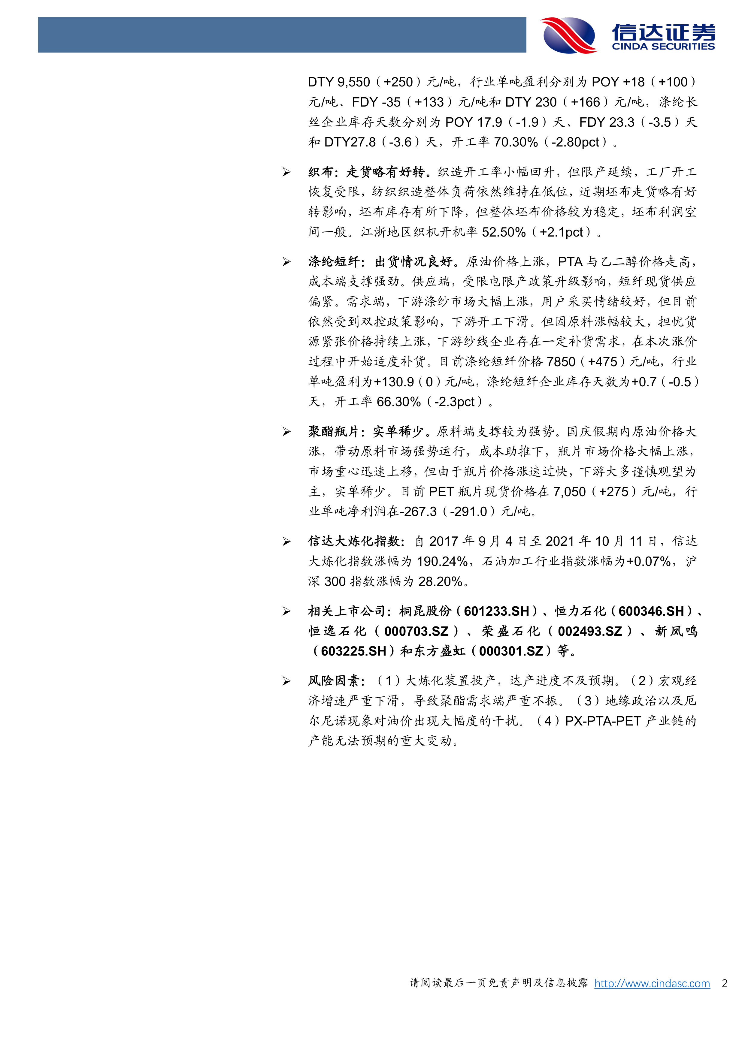 报告最后介绍了信达大炼化指数的走势,并列出了相关上市公司,例如桐昆股份、恒力石化、恒逸石化、荣盛石化、新凤鸣和东方盛虹等。信达大炼化指数自2017年9月4日至2021年10月11日涨幅为190.24%,显著高于同期石油加工行业指数和沪深300指数。