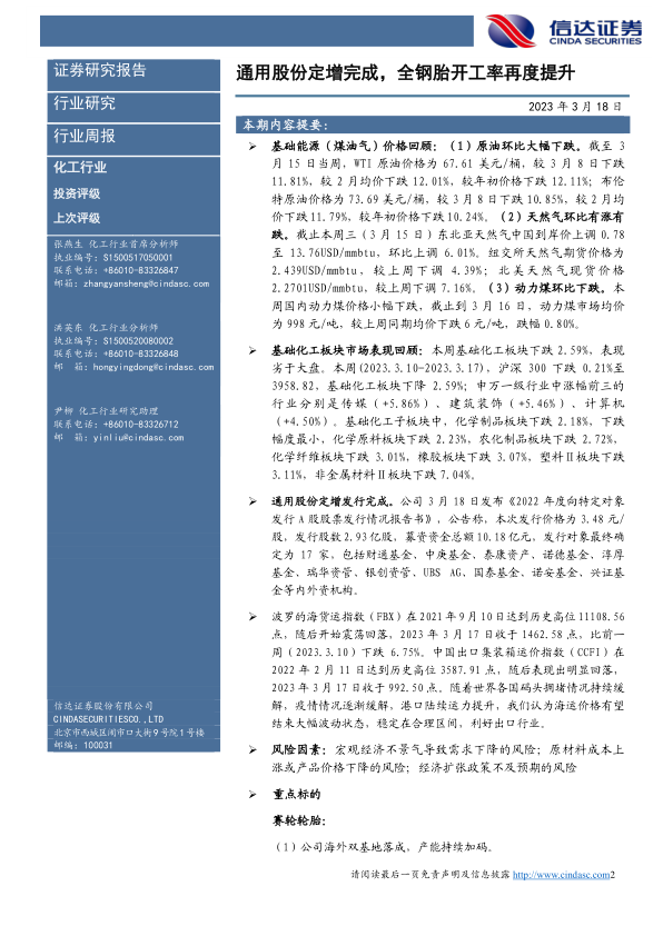 化工行业周报:通用股份定增完成,全钢胎开工率再度提升
