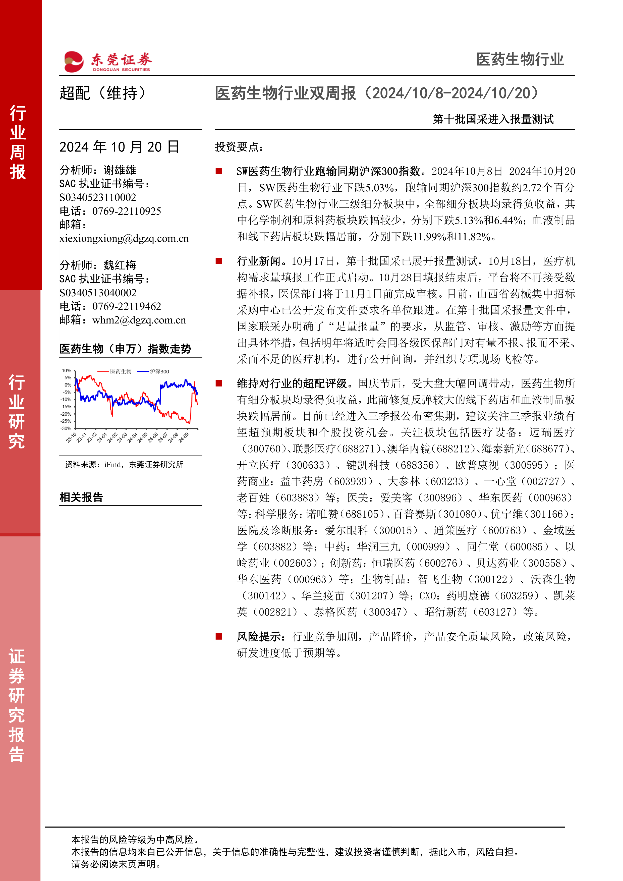 本报告对2024年10月8日至2024年10月20日期间SW医药生物行业的行情进行了回顾和分析,重点关注了第十批国采的进展以及部分上市公司的重要公告。尽管行业整体表现疲软,但报告维持对该行业的超配评级,并建议投资者关注三季报业绩有望超预期的板块和个股,同时需谨慎评估行业面临的各种风险。报告数据主要来自iFind和东莞证券研究所。 投资者应根据自身风险承受能力进行投资决策,本报告不构成投资建议。
