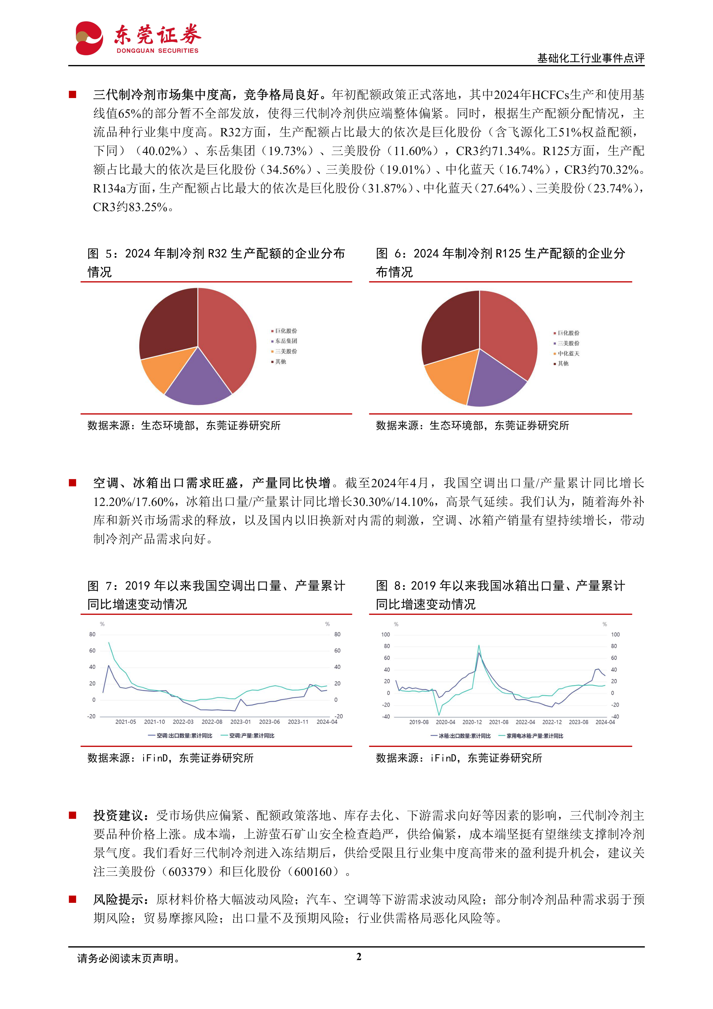 基于以上分析,报告建议关注三美股份(603379)和巨化股份(600160)。 然而,报告也提示了潜在的风险,包括: