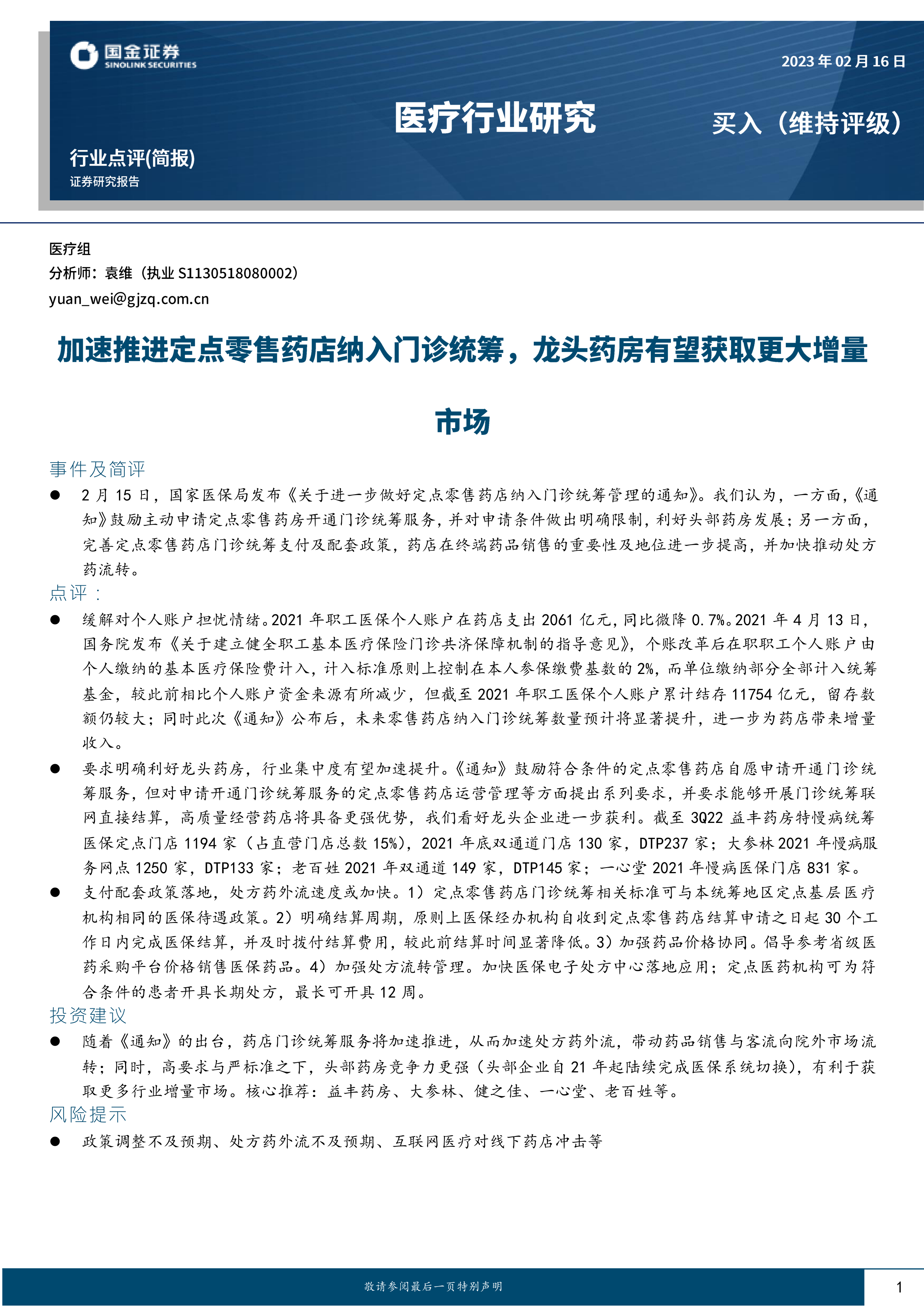 这份简报主要围绕国家医保局发布的《关于进一步做好定点零售药店纳入门诊统筹管理的通知》进行分析,内容涵盖政策解读、市场影响以及投资建议等方面。