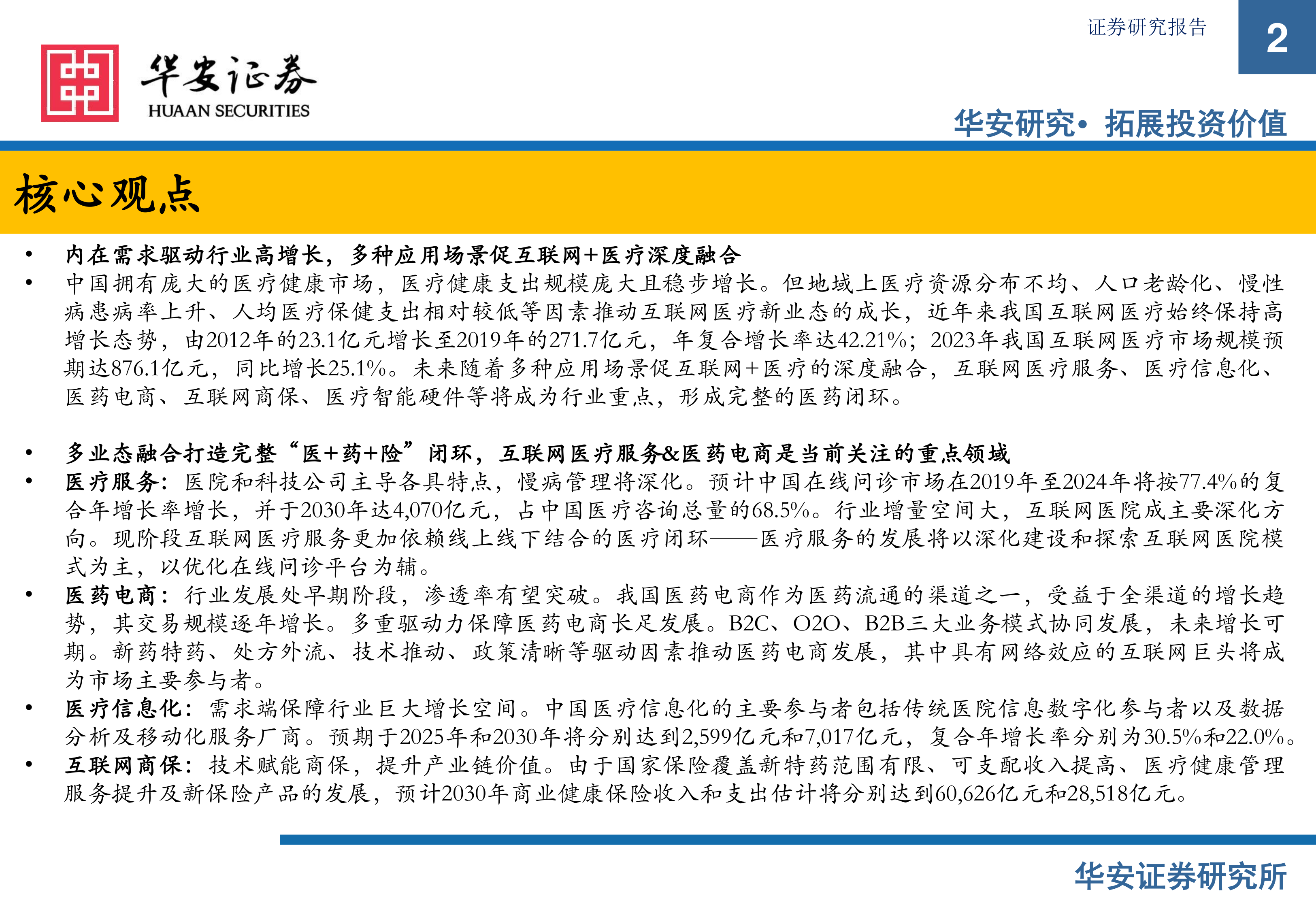 多业态融合打造完整“医+药+险”闭环,互联网医疗服务&医药电商是当前关注的重点领域