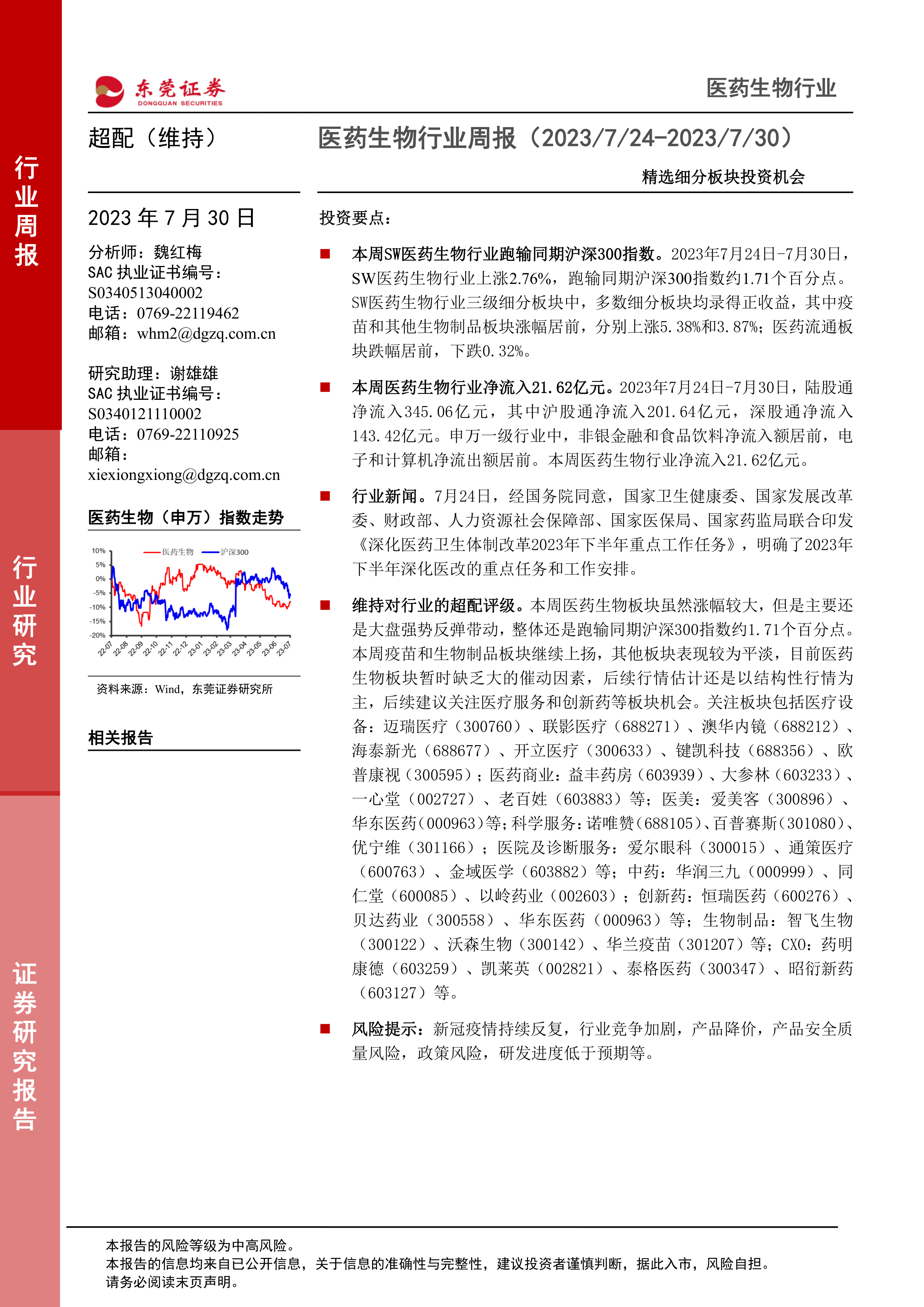 本报告对2023年7月24日至2023年7月30日SW医药生物行业的表现进行了全面分析。 尽管行业整体跑输沪深300指数,但多数细分板块和个股录得正收益,行业净流入资金显著,估值处于相对低位。 疫苗和其他生物制品板块表现突出,而医药流通板块表现相对低迷。 报告维持对医药生物行业的超配评级,但强调未来行情仍将以结构性行情为主,建议关注医疗服务和创新药等板块的投资机会,并提示了多种投资风险。 投资者应根据自身风险承受能力和投资目标,谨慎决策。