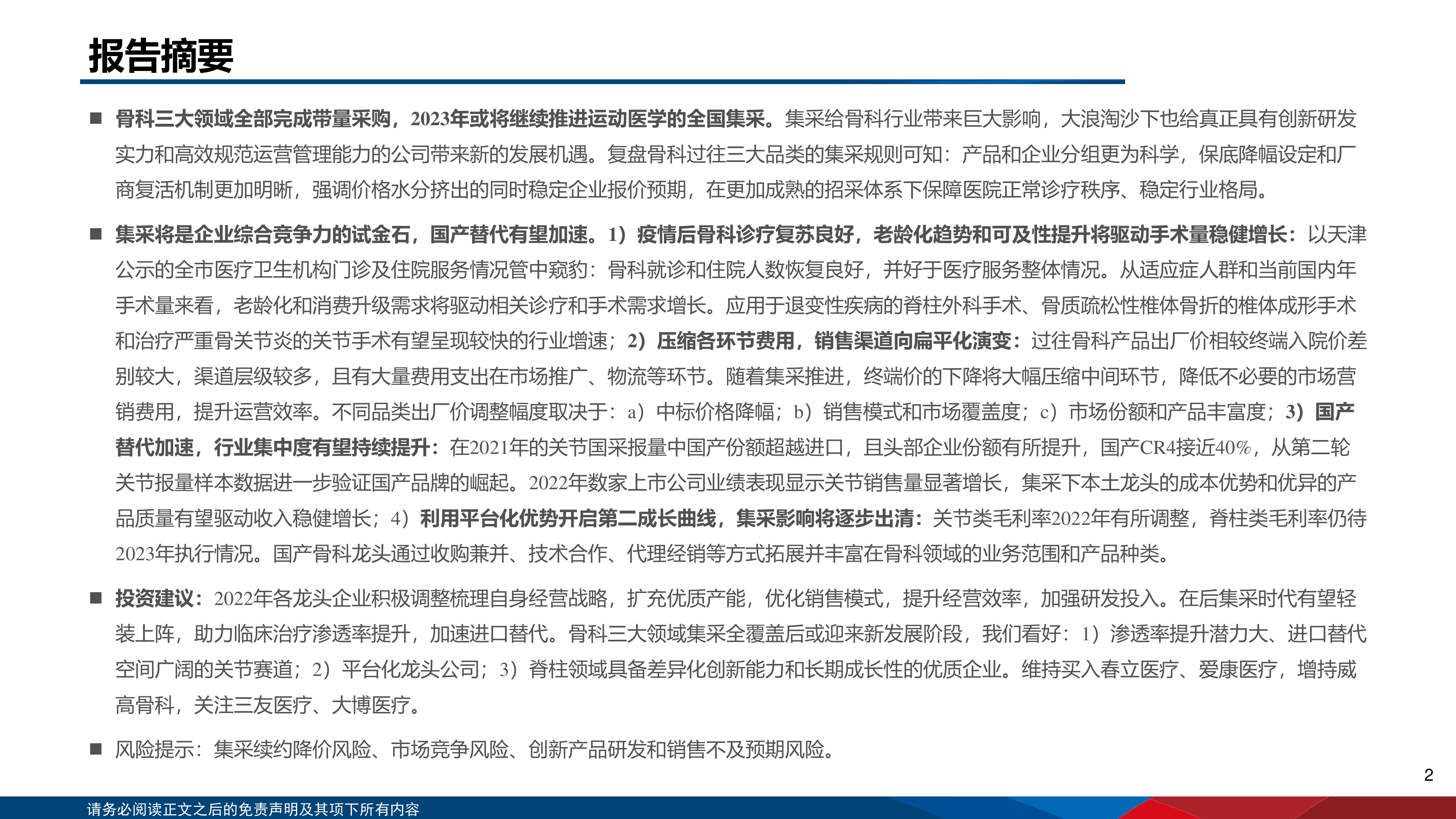 集采将是企业综合竞争力的试金石,国产替代有望加速。1)疫情后骨科诊疗复苏良好,老龄化趋势和可及性提升将驱动手术量稳健增长:以天津公示的全市医疗卫生机构门诊及住院服务情况管中窥豹:骨科就诊和住院人数恢复良好,并好于医疗服务整体情况。从适应症人群和当前国内年手术量来看,老龄化和消费升级需求将驱动相关诊疗和手术需求增长。应用于退变性疾病的脊柱外科手术、骨质疏松性椎体骨折的椎体成形手术和治疗严重骨关节炎的关节手术有望呈现较快的行业增速;2)压缩各环节费用,销售渠道向扁平化演变:过往骨科产品出厂价相较终端入院价差别较大,渠道层级较多,且有大量费用支出在市场推广、物流等环节。随着集采推进,终端价的下降将大幅压缩中间环节,降低不必要的市场营销费用,提升运营效率。不同品类出厂价调整幅度取决于:a)中标价格降幅;b)销售模式和市场覆盖度;c)市场份额和产品丰富度;3)国产替代加速,行业集中度有望持续提升:在2021年的关节国采报量中国产份额超越进口,且头部企业份额有所提升,国产CR4接近40%,从第二轮关节报量样本数据进一步验证国产品牌的崛起。2022年数家上市公司业绩表现显示关节销售量显著增长,集采下本土龙头的成本优势和优异的产品质量有望驱动收入稳健增长;4)利用平台化优势开启第二成长曲线,集采影响将逐步出清:关节类毛利率2022年有所调整,脊柱类毛利率仍待2023年执行情况。国产骨科龙头通过收购兼并、技术合作、代理经销等方式拓展并丰富在骨科领域的业务范围和产品种类。
