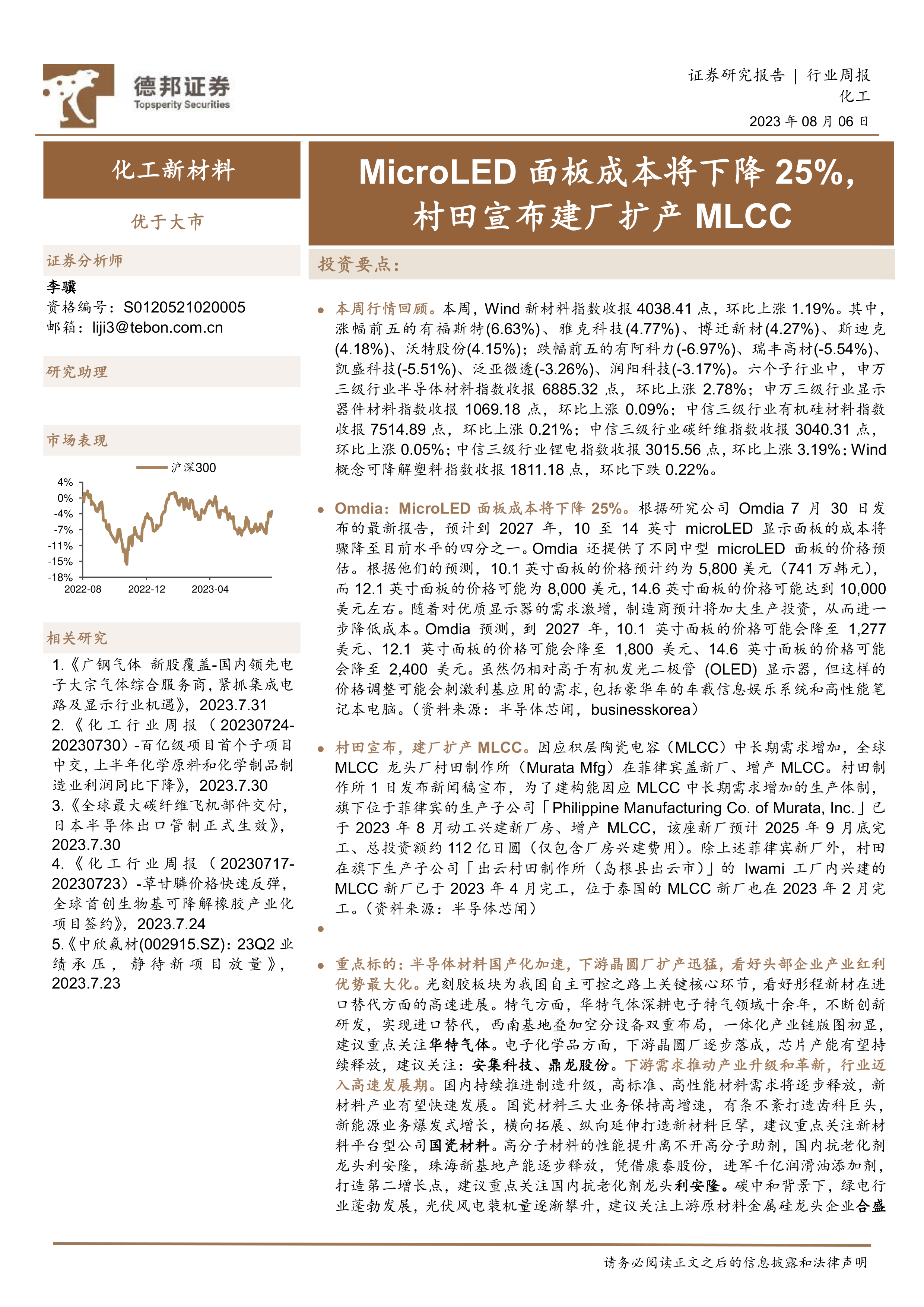 化工新材料行业周报:MicroLED面板成本将下降25%,村田宣布建厂扩产MLCC