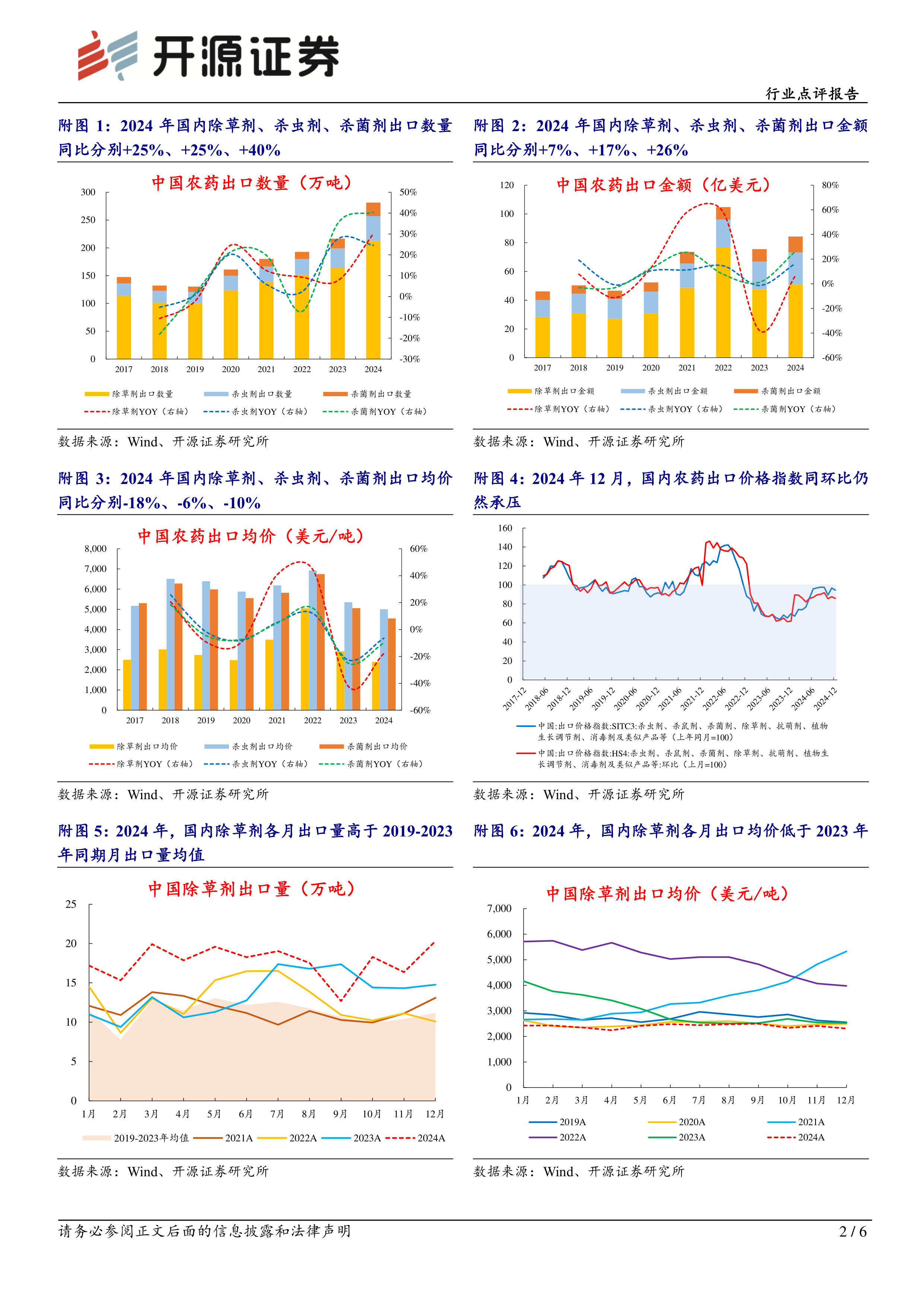 本报告基于草甘膦行业反内卷专题会议和农药行业市场数据,分析了草甘膦行业和农药行业的市场现状及未来发展趋势。报告认为,草甘膦行业反内卷将利好龙头企业发展,而全球农药去库存和春耕旺季将推动部分农药产品价格反弹,助力行业盈利修复。报告最后给出了具体的投资建议,并对相关风险进行了提示。 报告中提供的图表数据直观地展现了农药行业出口情况及价格波动,为投资者提供了重要的参考信息。 需要注意的是,报告中的分析和预测基于一定的假设和模型,存在一定的局限性,投资者应谨慎参考。