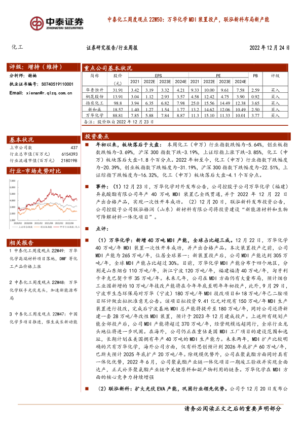 事件: (1) 12 月 23 日,万华化学对外发布公告,公司控股子公司万华化学(福建)异氰酸酯有限公司年产 40 万吨 MDI 装置已全线贯通,并于 2022 年 12 月 22 日产出合格产品,实现一次性开车成功。 (2) 12 月 20 日,联泓新科发布投资公告,公司控股子公司联泓格润(山东)新材料有限公司将投资建设“新能源材料和生物可降解材料一体化项目” 。