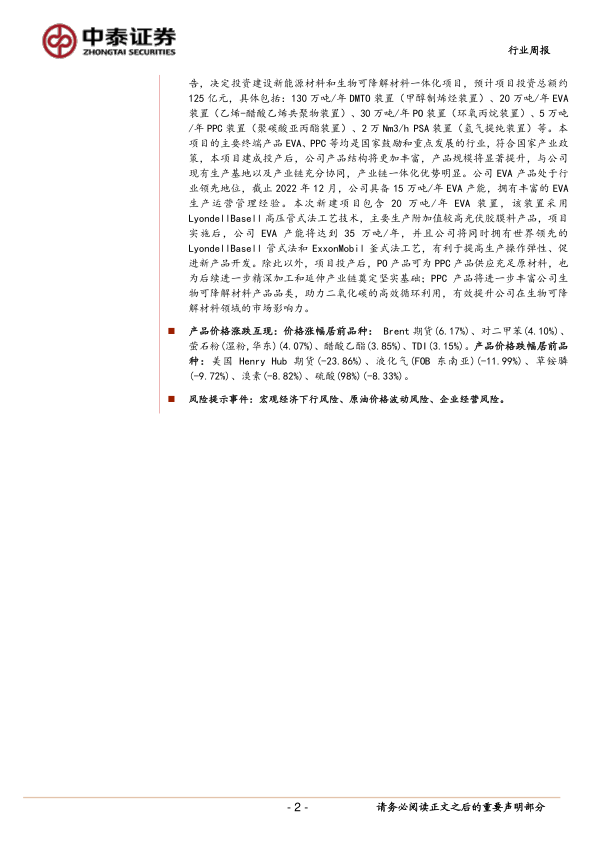 (2)联泓新科:扩大光伏 EVA 产能,巩固行业领先优势。 公司于 12 月 20 日发布公告,决定投资建设新能源材料和生物可降解材料一体化项目,预计项目投资总额约125 亿元,具体包括: 130 万吨/年 DMTO 装置(甲醇制烯烃装置)、 20 万吨/年 EVA装置(乙烯-醋酸乙烯共聚物装置)、 30 万吨/年 PO 装置(环氧丙烷装置)、 5 万吨/年 PPC 装置(聚碳酸亚丙酯装置)、 2 万 Nm3/h PSA 装置(氢气提纯装置)等。本项目的主要终端产品 EVA、 PPC 等均是国家鼓励和重点发展的行业,符合国家产业政策,本项目建成投产后,公司产品结构将更加丰富, 产品规模将显著提升,与公司现有生产基地以及产业链充分协同,产业链一体化优势明显。公司 EVA 产品处于行业领先地位,截止 2022 年 12 月,公司具备 15 万吨/年 EVA 产能,拥有丰富的 EVA生产运营管理经验。本次新建项目包含 20 万吨/年 EVA 装置,该装置采用LyondellBasell 高压管式法工艺技术,主要生产附加值较高光伏胶膜料产品,项目实施后,公司 EVA 产能将达到 35 万吨/年,并且公司将同时拥有世界领先的LyondellBasell 管式法和 ExxonMobil 釜式法工艺,有利于提高生产操作弹性、促进新产品开发。除此以外,项目投产后, PO 产品可为 PPC 产品供应充足原材料,也为后续进一步精深加工和延伸产业链奠定坚实基础; PPC 产品将进一步丰富公司生物可降解材料产品品类,助力二氧化碳的高效循环利用,有效提升公司在生物可降解材料领域的市场影响力。