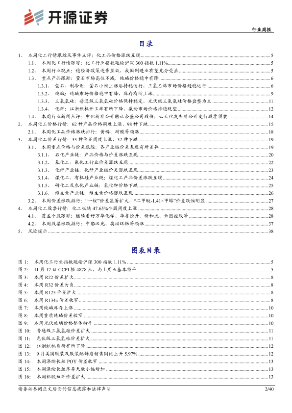 本部分详细跟踪了本周化工行业指数、CCPI指数以及重点化工产品的价格和价差走势。化工行业指数跑输沪深300指数1.11%,化工板块个股涨跌互现。重点产品方面,萤石市场价格高位运行,无水氟化氢市场货源偏紧;纯碱价格稳中有降,库存有所上涨;三氯氢硅价格保持稳定;化纤行业江浙织机开工率有所下降,氨纶市场价格持稳观望。此外,报告还点评了中化国际非公开转让合盛公司股份以及云天化发布定增预案等行业新闻。