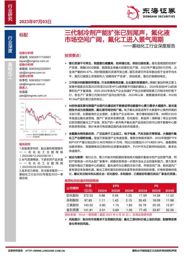 结论与推荐:我们认为,第三代制冷剂配额的落地将大幅提升氟制冷剂产业的景气度,同时产能将进一步向头部厂家集中,规模优势将进一步提升龙头企业的盈利能力。算力需求的提升推动了数据中心的建设,氟化液作为主要的冷却介质,市场空间广阔,相关国内厂家有望迎来发展机遇。氟化工原料萤石的供给收紧带来供需结构的改善,价格有望维持高位。建议关注制冷剂头部企业:巨化股份、永和股份、三美股份和萤石供应厂家金石资源。