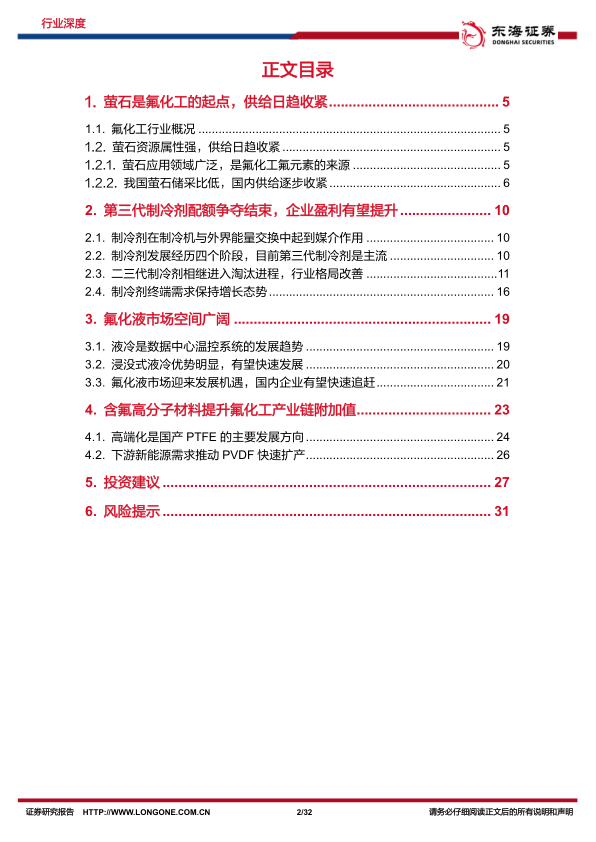 本报告基于对萤石资源、制冷剂、氟化液和含氟高分子材料市场现状及未来发展趋势的分析,认为氟化工行业正处于景气周期。萤石资源供给收紧、三代制冷剂配额落地以及氟化液市场空间广阔是推动行业景气度提升的主要因素。报告建议投资者关注相关龙头企业,但同时也需注意行业面临的风险。