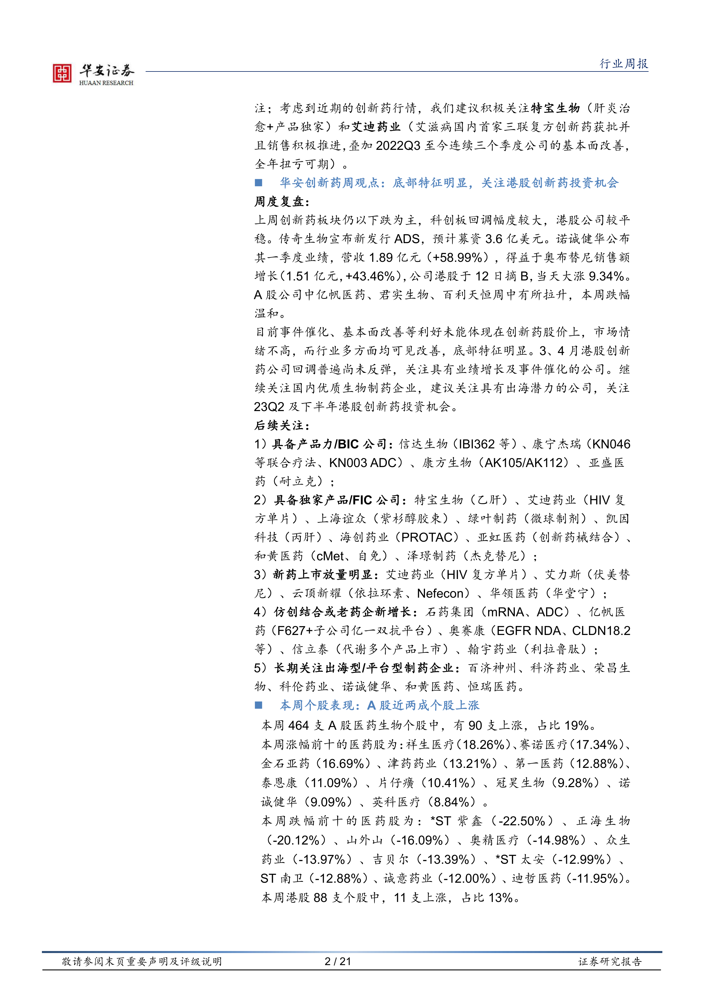 报告对A股和港股医药个股的表现进行了详细分析。A股市场中,近两成个股上涨,涨幅前十的个股主要集中在医疗器械、中药等领域;跌幅前十的个股则较为分散。港股市场中,超一成个股上涨,中药标的领涨。 报告还对部分个股进行了深入分析,例如:广誉远(中药名贵OTC,财务状况改善)、亚辉龙(发光领域超跌标的,新冠受益)、天士力(中药创新药领先企业)、健麾信息(药房自动化设备,AI驱动)、特宝生物(肝炎治愈+产品独家)、艾迪药业(艾滋病创新药)。 这些个股分析突出了业绩增长、核心竞争力以及政策利好等因素对个股表现的影响。