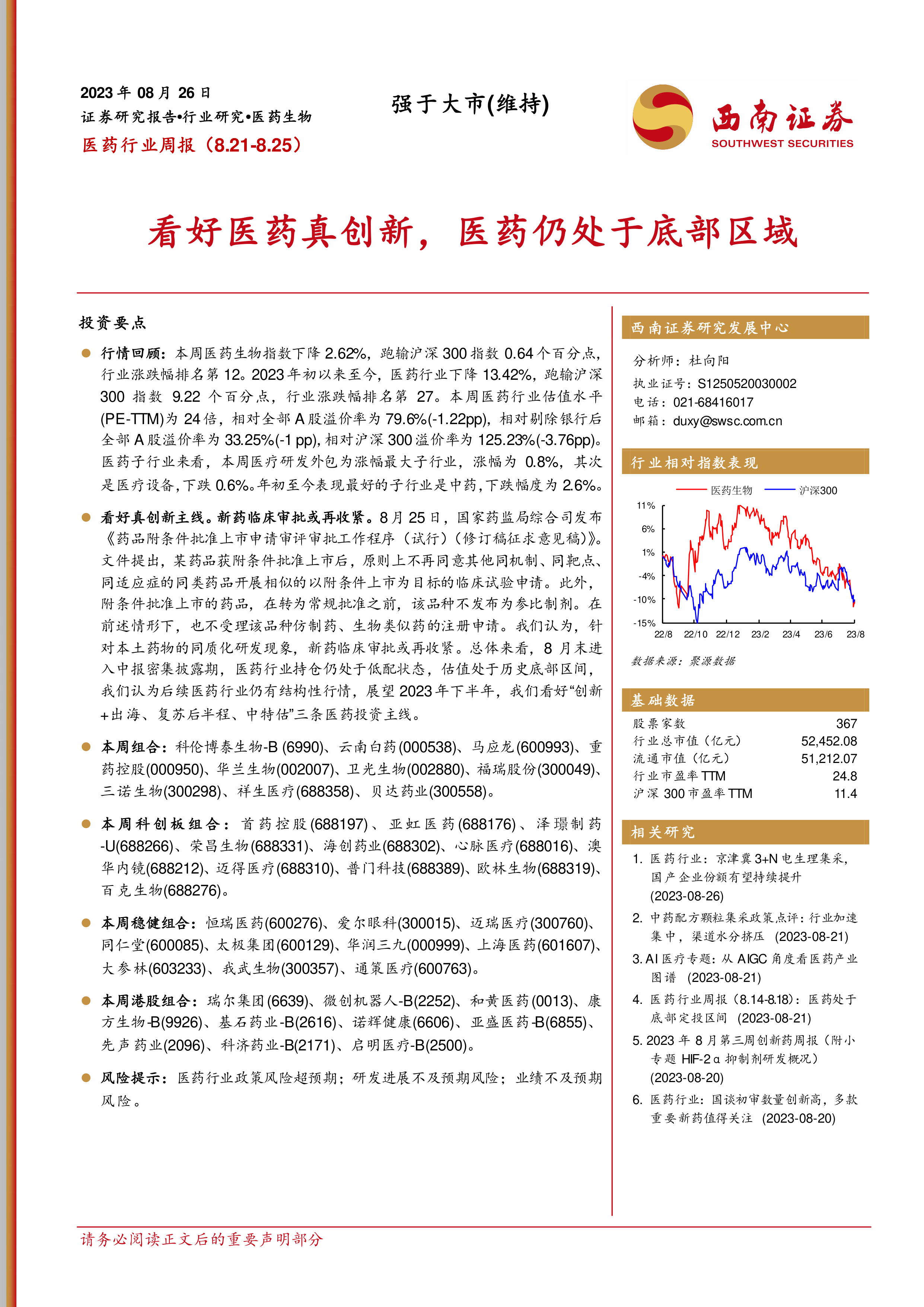 本报告基于公开数据,对 2023年8月21日至25日一周的医药行业市场表现进行了全面的分析。报告指出,尽管本周医药行业指数下跌,但行业估值处于历史底部,且持仓低配,未来仍存在结构性行情机会。 新药审批政策的收紧将有利于真正具有创新性的企业。报告重点推荐了“创新+出海、复苏后半程、中特估”三条投资主线,并提供了相应的投资组合建议。 投资者需注意报告中提到的风险提示,并根据自身情况进行投资决策。 本报告仅供参考,不构成投资建议。