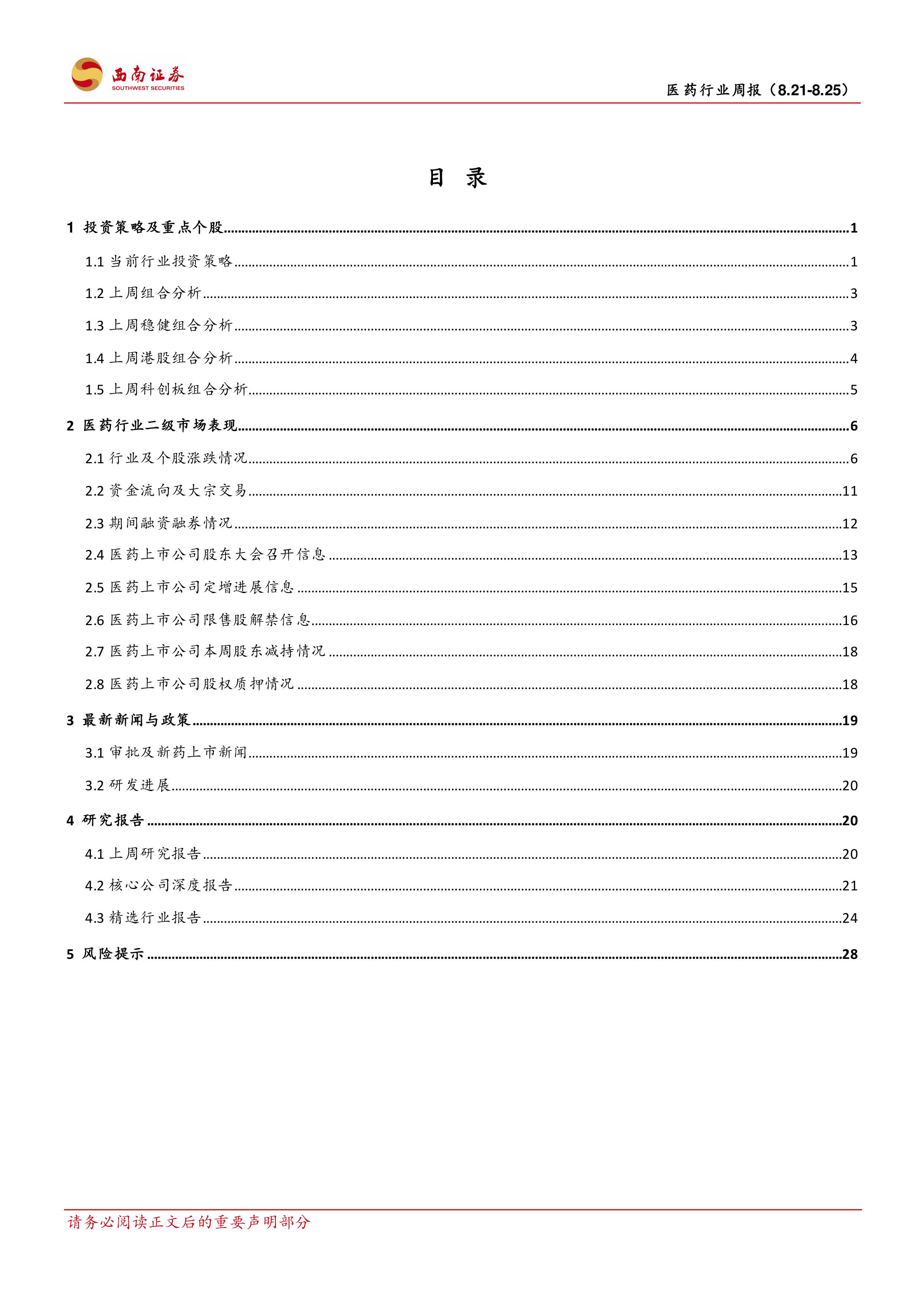 风险提示:医药行业政策风险超预期;研发进展不及预期风险;业绩不及预期风险。