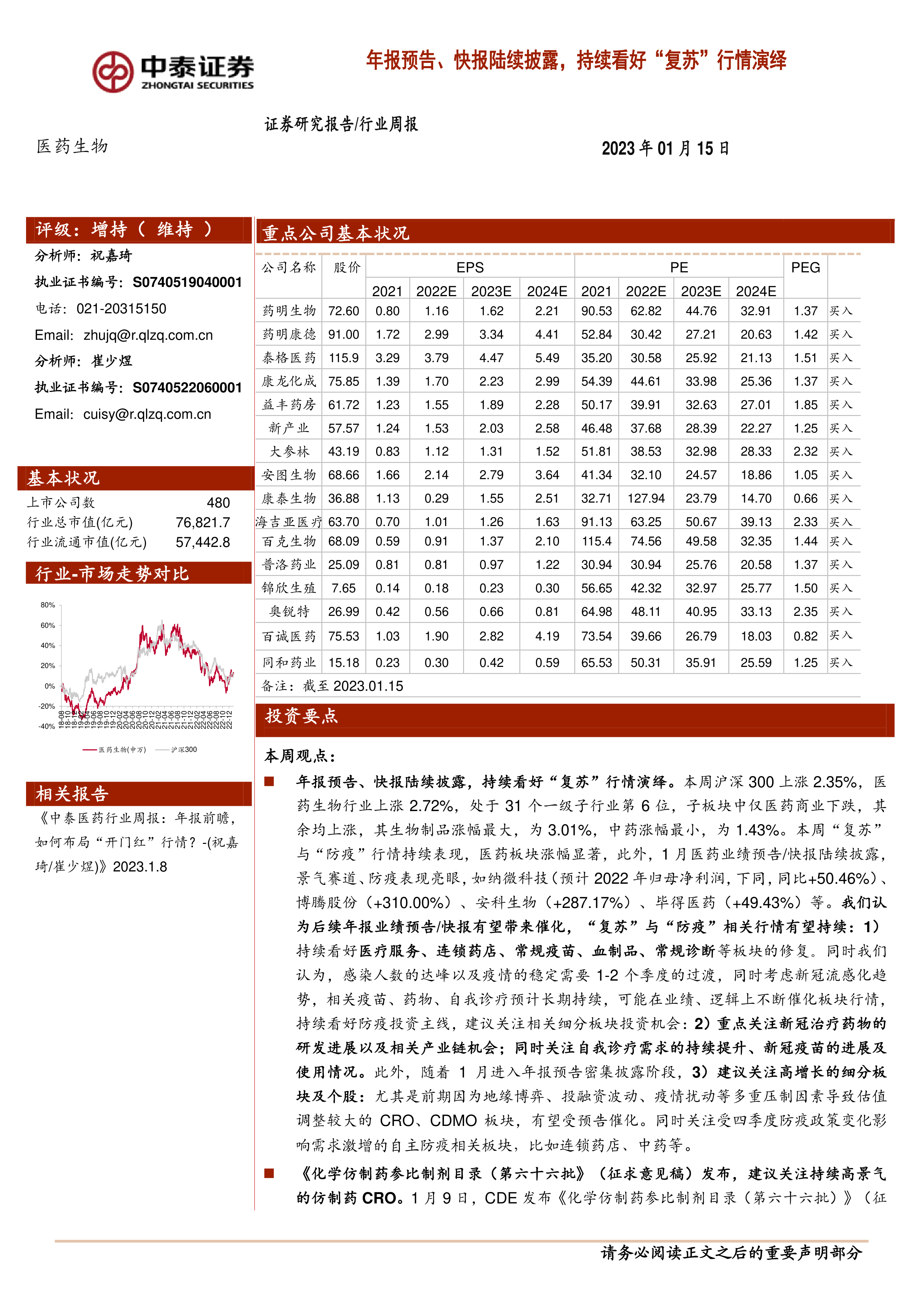年报预告、快报陆续披露,持续看好“复苏”行情演绎。本周沪深300上涨2.35%,医药生物行业上涨2.72%,处于31个一级子行业第6位,子板块中仅医药商业下跌,其余均上涨,其生物制品涨幅最大,为3.01%,中药涨幅最小,为1.43%。本周“复苏”与“防疫”行情持续表现,医药板块涨幅显著,此外,1月医药业绩预告/快报陆续披露,景气赛道、防疫表现亮眼,如纳微科技(预计2022年归母净利润,下同,同比+50.46%)、博腾股份(+310.00%)、安科生物(+287.17%)、毕得医药(+49.43%)等。我们认为后续年报业绩预告/快报有望带来催化,“复苏”与“防疫”相关行情有望持续:1)持续看好医疗服务、连锁药店、常规疫苗、血制品、常规诊断等板块的修复。同时我们认为,感染人数的达峰以及疫情的稳定需要1-2个季度的过渡,同时考虑新冠流感化趋势,相关疫苗、药物、自我诊疗预计长期持续,可能在业绩、逻辑上不断催化板块行情,持续看好防疫投资主线,建议关注相关细分板块投资机会:2)重点关注新冠治疗药物的研发进展以及相关产业链机会;同时关注自我诊疗需求的持续提升、新冠疫苗的进展及使用情况。此外,随着1月进入年报预告密集披露阶段,3)建议关注高增长的细分板块及个股:尤其是前期因为地缘博弈、投融资波动、疫情扰动等多重压制因素导致估值调整较大的CRO、CDMO板块,有望受预告催化。同时关注受四季度防疫政策变化影响需求激增的自主防疫相关板块,比如连锁药店、中药等。