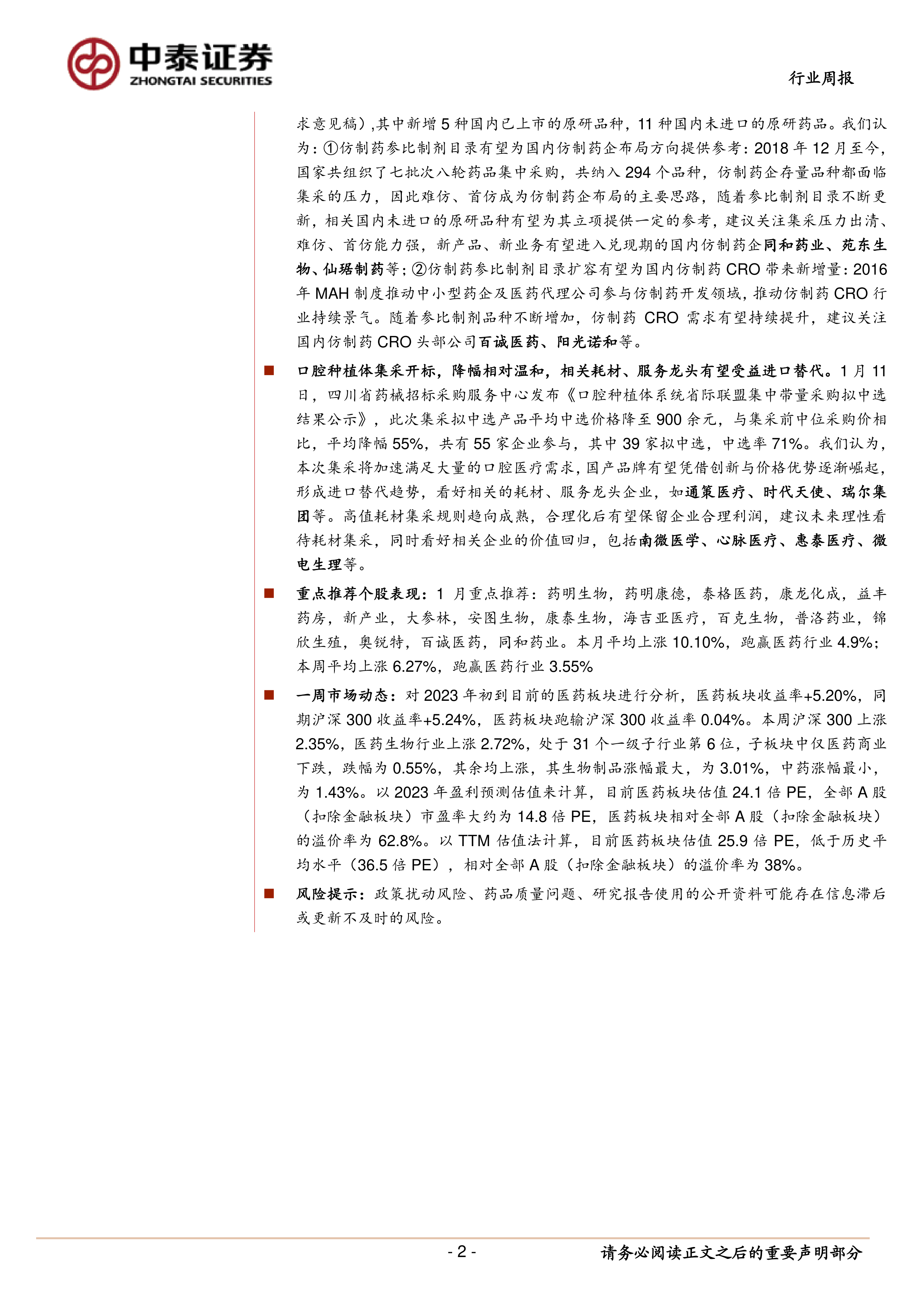 医药板块2023年初至今收益率+5.24%,同期沪深300收益率+5.20%,医药板块略微跑输大盘。本周医药生物行业上涨2.72%,跑赢沪深300。报告最后列出了政策扰动风险、药品质量问题、信息滞后等风险提示。