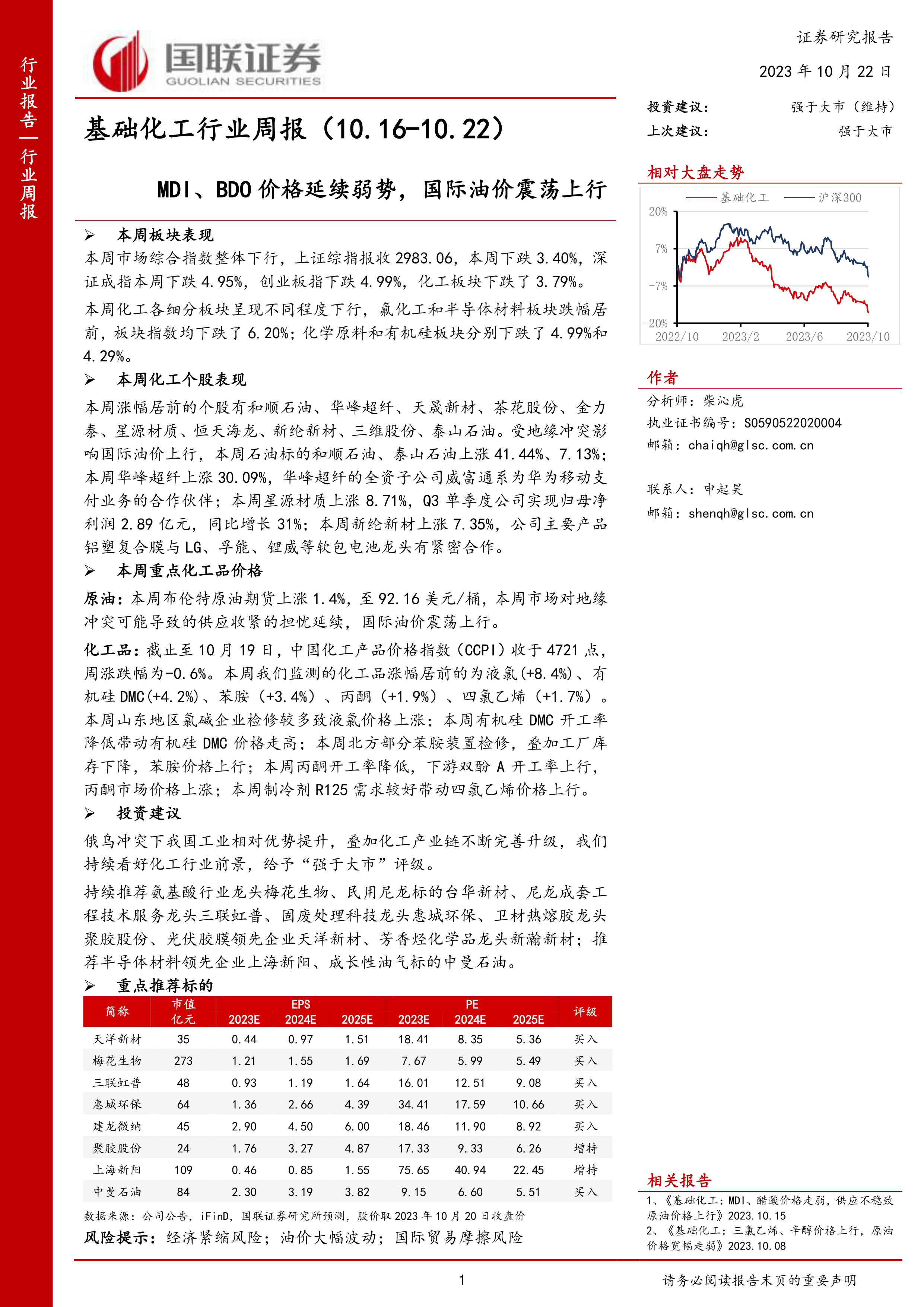 基础化工行业周报:MDI、BDO价格延续弱势,国际油价震荡上行