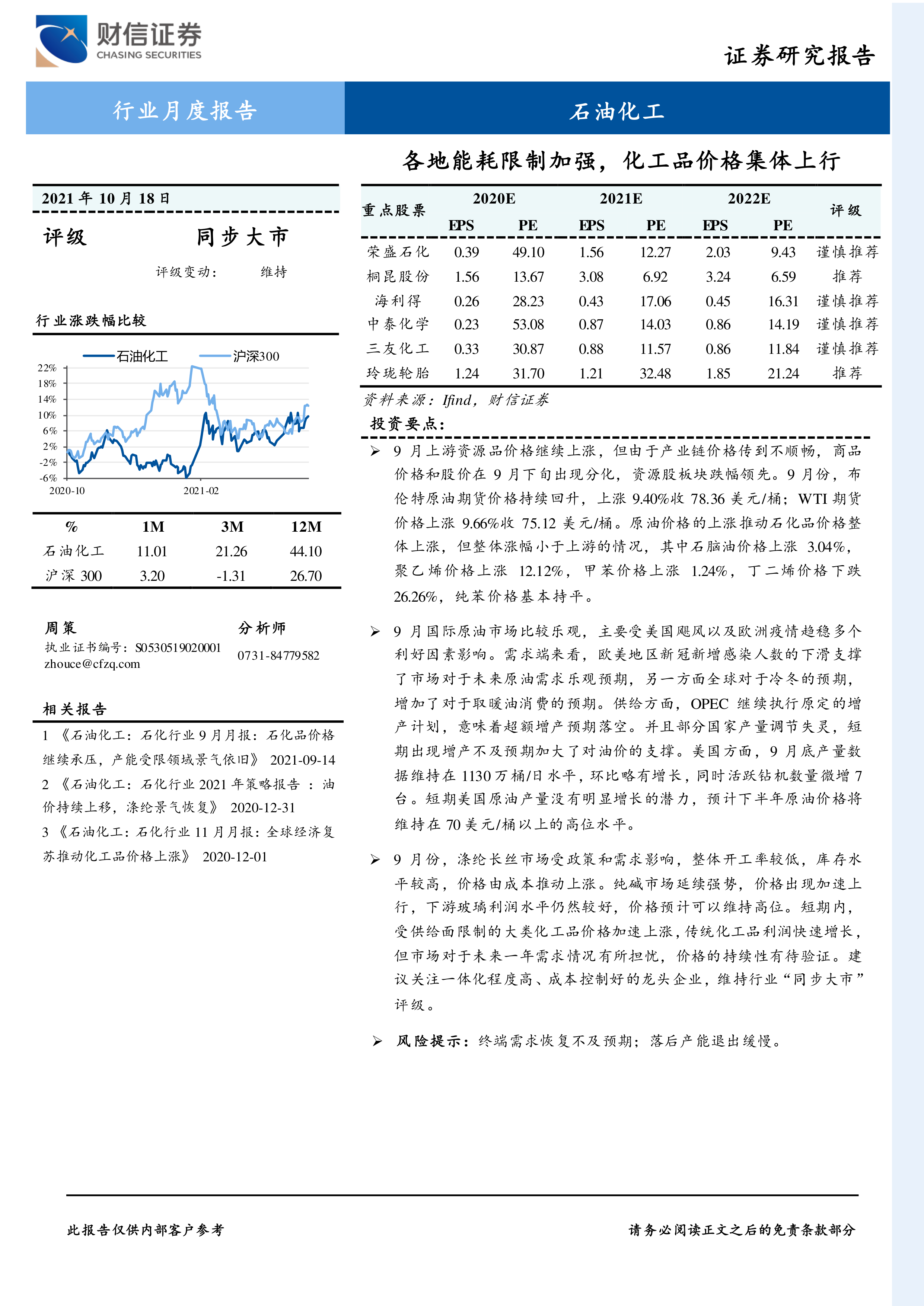 本报告的核心观点是:2021年9月,受国际原油价格上涨及各地能耗限制加强的影响,化工品价格集体上行,但产业链价格传导不畅,导致商品价格和股价在9月下旬出现分化,资源股板块跌幅领先。 报告建议关注一体化程度高、成本控制好的龙头企业,并对部分细分行业龙头企业给出投资建议,同时提示了终端需求恢复不及预期和落后产能退出缓慢的风险。