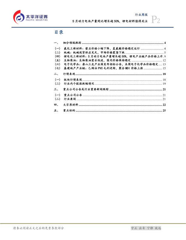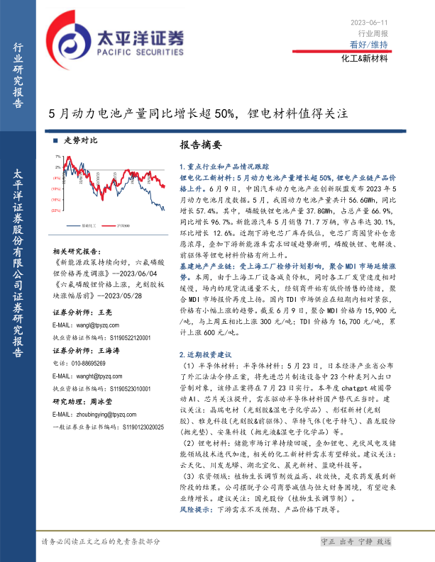 本报告基于公开数据,对化工行业多个细分领域的市场行情进行了全面分析,并对未来走势进行了预测。5月份动力电池产量的高增长以及下游需求的回暖,推动了锂电材料价格上涨,值得投资者关注。 报告还分析了其他细分领域的市场表现,并对部分公司和板块提出了投资建议,但需注意报告中存在的风险提示。 投资者应结合自身情况,谨慎决策。