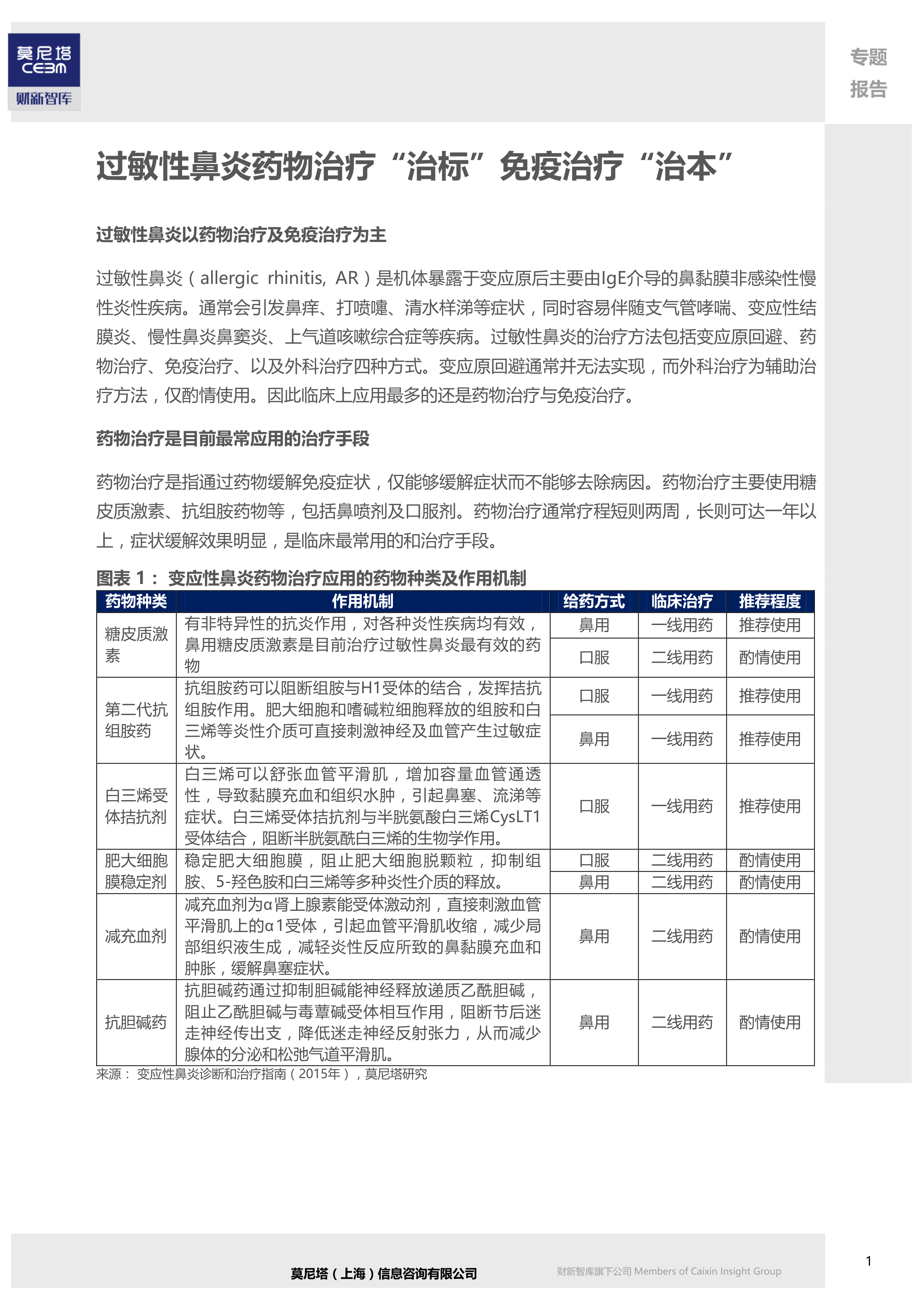 本报告的核心观点是:过敏性鼻炎免疫治疗市场潜力巨大,但目前市场规模远未达到其潜力上限。虽然存在价格较高、医保覆盖不足以及变应原检测手段有限等限制因素,但随着临床指南的更新、人民生活水平的提高以及检测技术的进步,这些限制因素正在逐渐消除,免疫治疗有望迎来快速增长,市场规模有望突破百亿元。