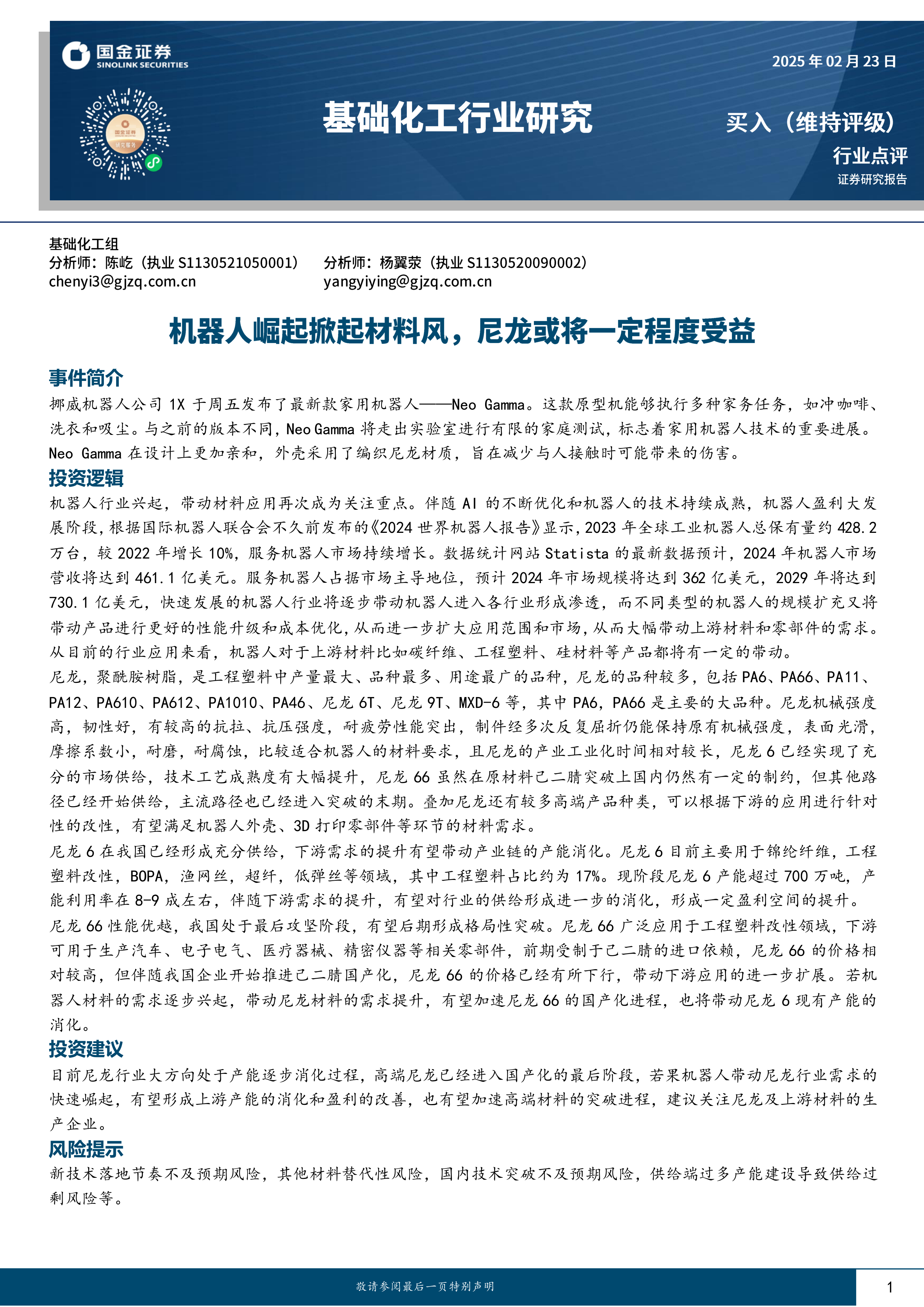 本报告基于Neo Gamma家用机器人的发布,分析了家用机器人市场快速发展的趋势,并预测了其对上游材料需求的拉动作用。报告重点关注尼龙材料在机器人领域的应用前景,认为尼龙材料的优异性能和成熟的产业化基础,使其有望成为家用机器人领域的关键材料,从而带动尼龙行业产能消化和盈利能力提升,加速高端尼龙材料的国产化进程。 报告最后给出了投资建议和风险提示,为投资者提供了参考。 然而,需注意报告中提到的风险因素,并进行独立的风险评估。 未来,持续关注机器人技术发展和市场变化,以及尼龙材料的市场供需动态,将有助于更准确地把握投资机会。