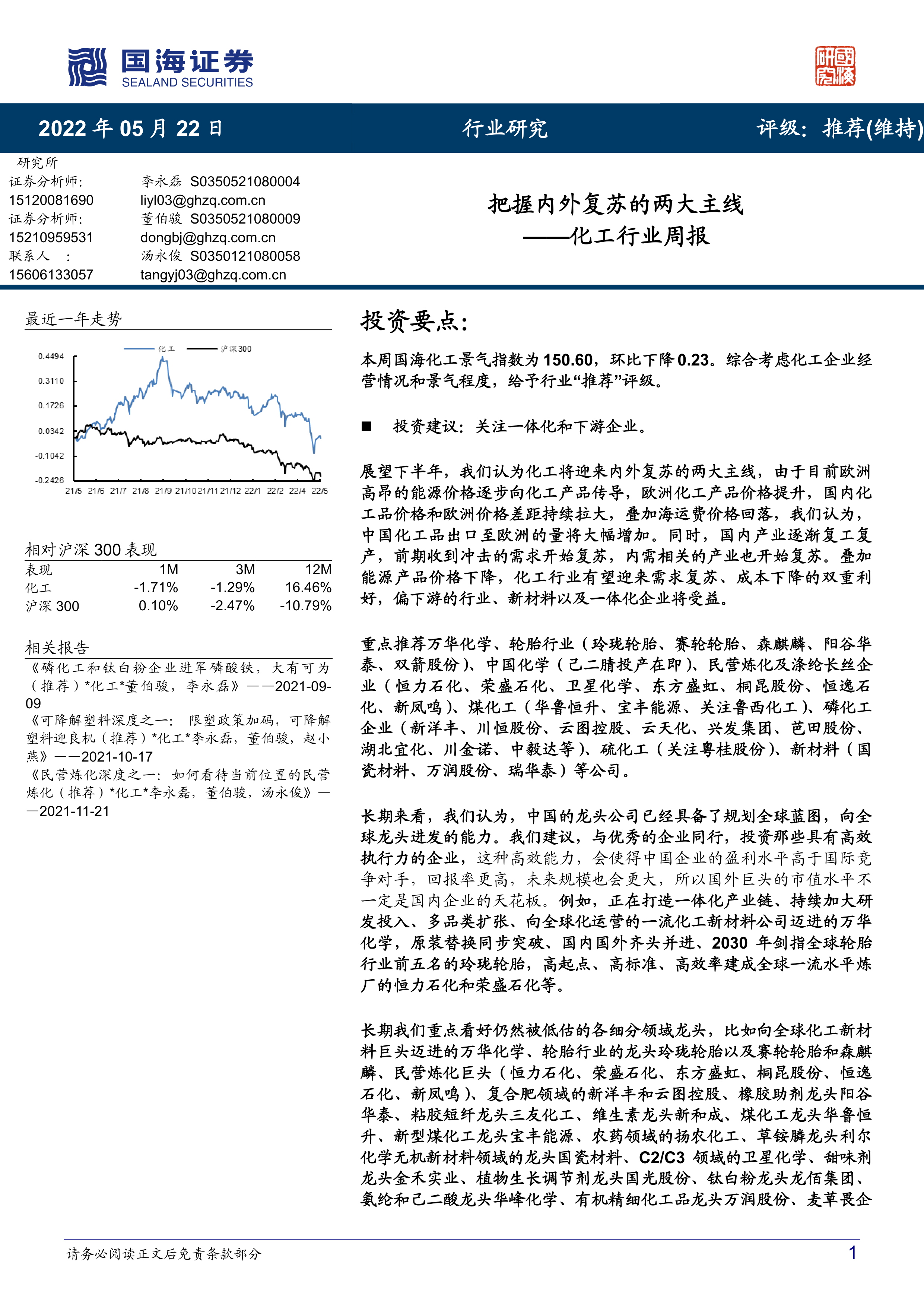 本报告维持对化工行业的“推荐”评级,并指出下半年化工行业将迎来内外复苏的两大主线:一是欧洲高昂能源价格导致欧洲化工产品价格上涨,中欧化工产品价格差扩大,叠加海运费下降,利好中国化工产品对欧洲出口;二是国内产业复工复产,内需逐步复苏,能源价格下降,将推动化工行业需求复苏和成本下降。报告重点推荐万华化学、玲珑轮胎等龙头企业,并对部分重点公司进行了信息跟踪和盈利预测。