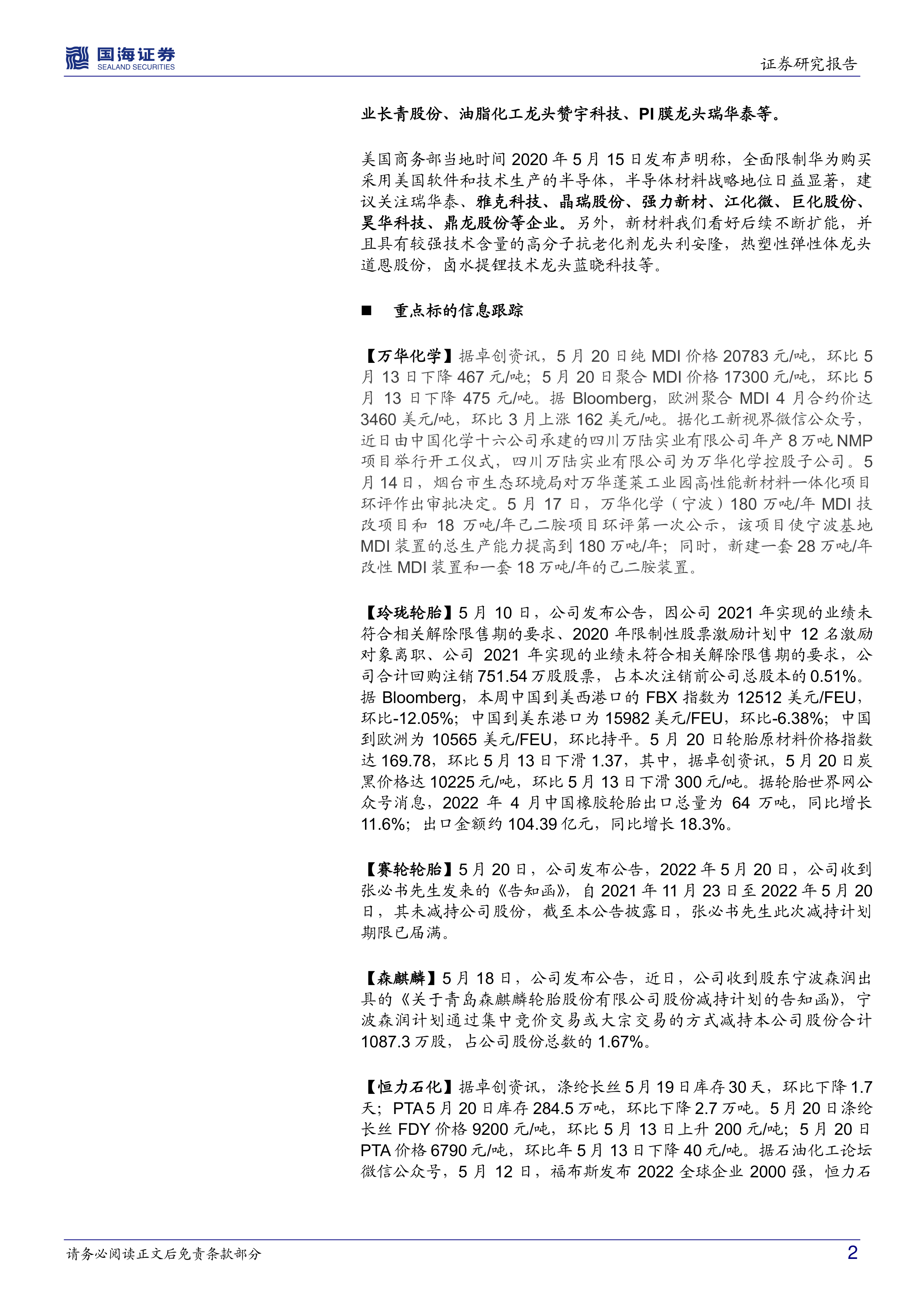 报告对万华化学、玲珑轮胎、赛轮轮胎、森麒麟、恒力石化、荣盛石化、东方盛虹、恒逸石化、桐昆股份、新凤鸣、新洋丰、云图控股、龙佰集团、中毅达、中国化学、双箭股份、阳谷华泰、华峰化学、新和成、三友化工、华鲁恒升、宝丰能源、国瓷材料、金禾实业、瑞华泰、赞宇科技、扬农化工、利尔化学、国光股份、长青股份、卫星化学、道恩股份、三棵树、金发科技、江化微、万润股份、蓝晓科技、利安隆、粤桂股份等多家化工企业进行了重点跟踪,提供了各公司近期经营情况、财务数据、以及行业动态分析。 数据涵盖了产品价格(MDI、PTA、涤纶长丝、磷酸一铵、维生素A、维生素E、乙二醇、纯碱、橡胶助剂等)、库存、产能、以及相关政策等方面。 部分公司还包含了例如环评审批、项目投产、股权回购、分红派息等重要信息。