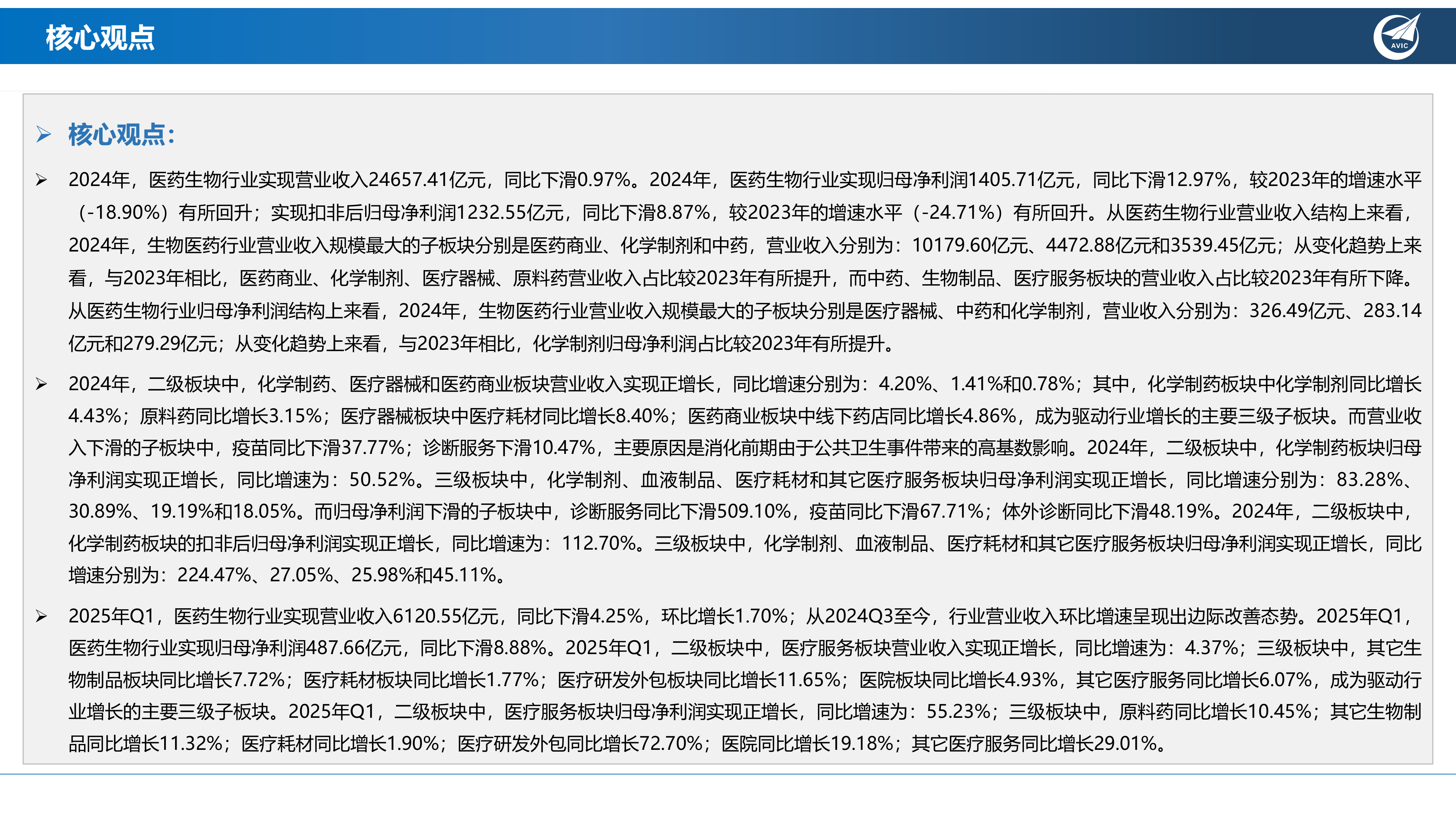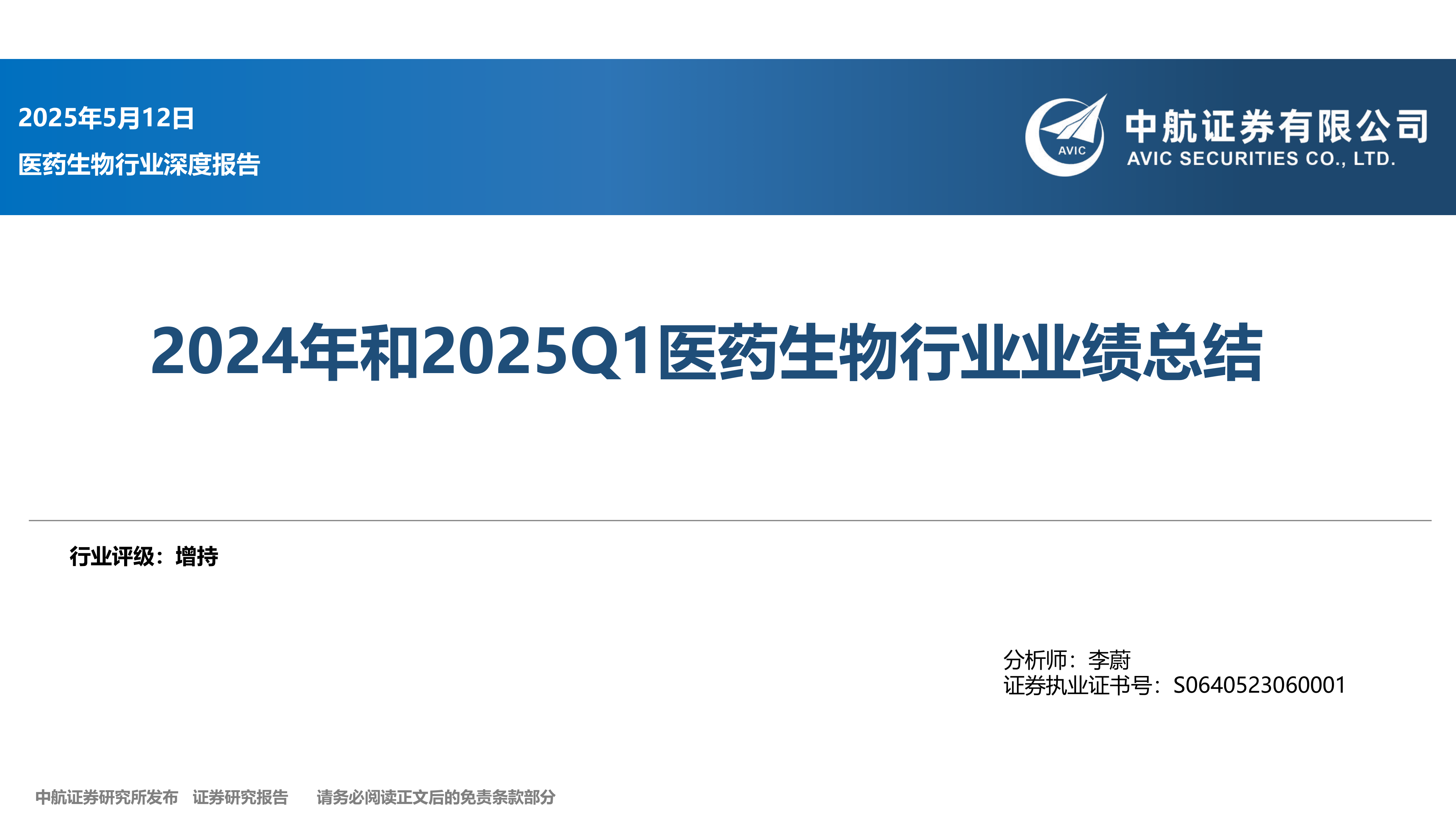 本报告基于中航证券研究所发布的《2025年5月12日 医药生物行业深度报告》,利用2024年全年及2025年第一季度的数据,对医药生物行业整体业绩及各子板块的经营状况进行专业分析。报告核心观点如下: