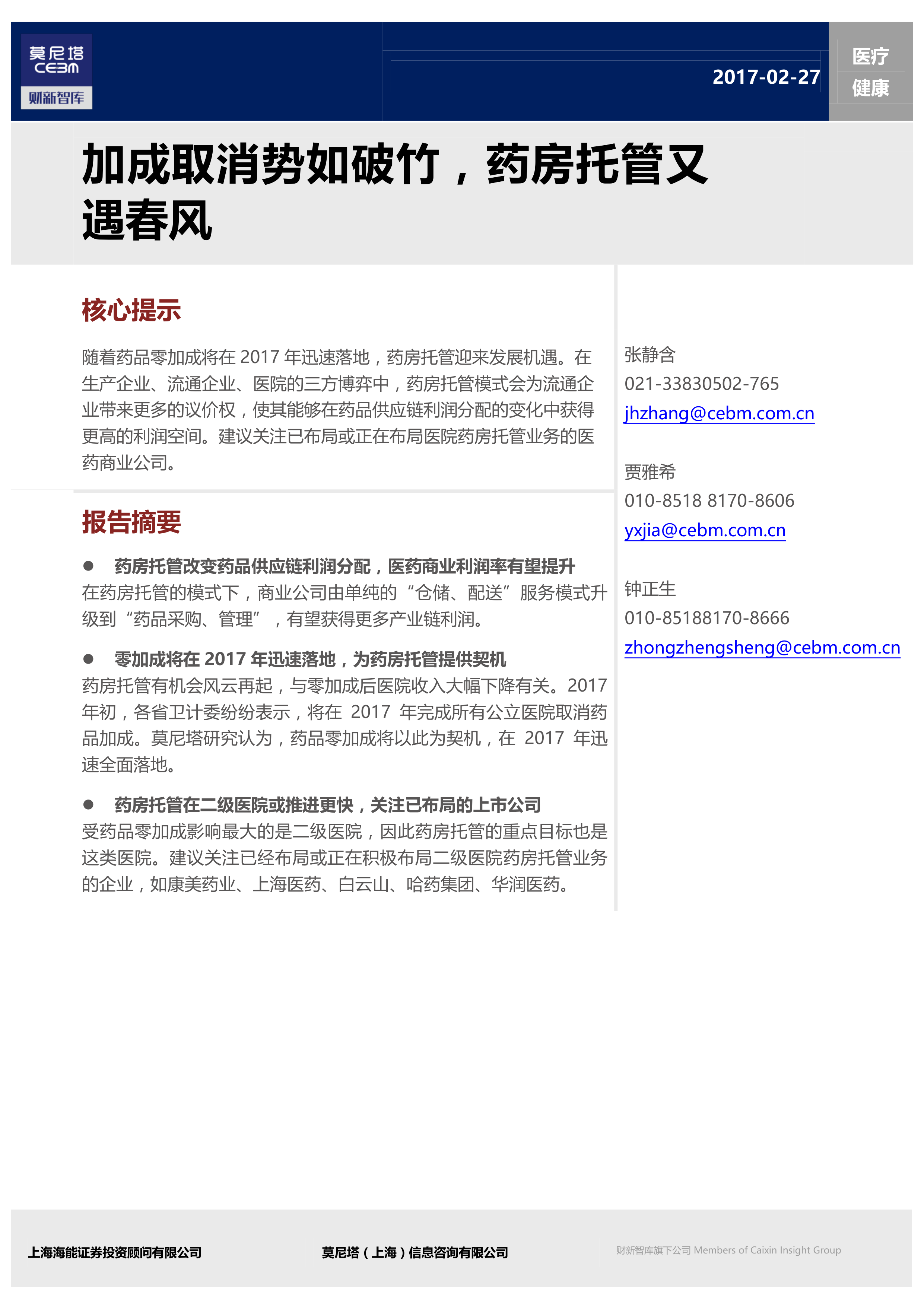本报告的核心观点是:随着2017年药品零加成政策的迅速落地,医院药房托管模式将迎来新的发展机遇。这种模式改变了药品供应链的利润分配,为医药商业公司带来了提升利润率的可能性。二级医院由于药品收入占比高、医疗收入占比低,将成为药房托管的重点目标。报告建议关注已布局或正在布局医院药房托管业务的医药商业公司。
