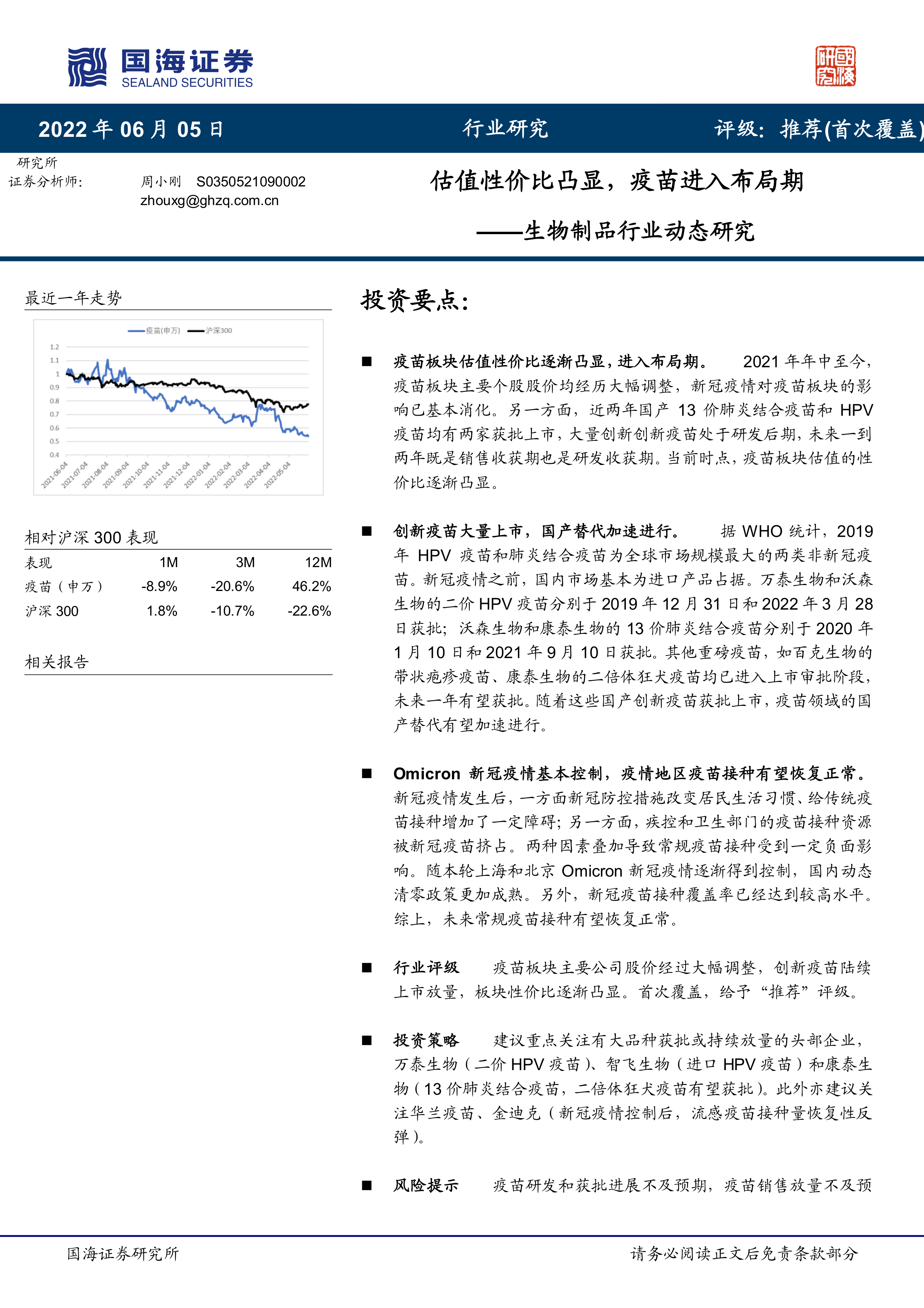 报告首先概述了生物制品行业动态,并提出了关键投资要点:疫苗板块估值性价比凸显,进入布局期;创新疫苗大量上市,国产替代加速;Omicron疫情基本控制,疫情地区疫苗接种有望恢复正常。