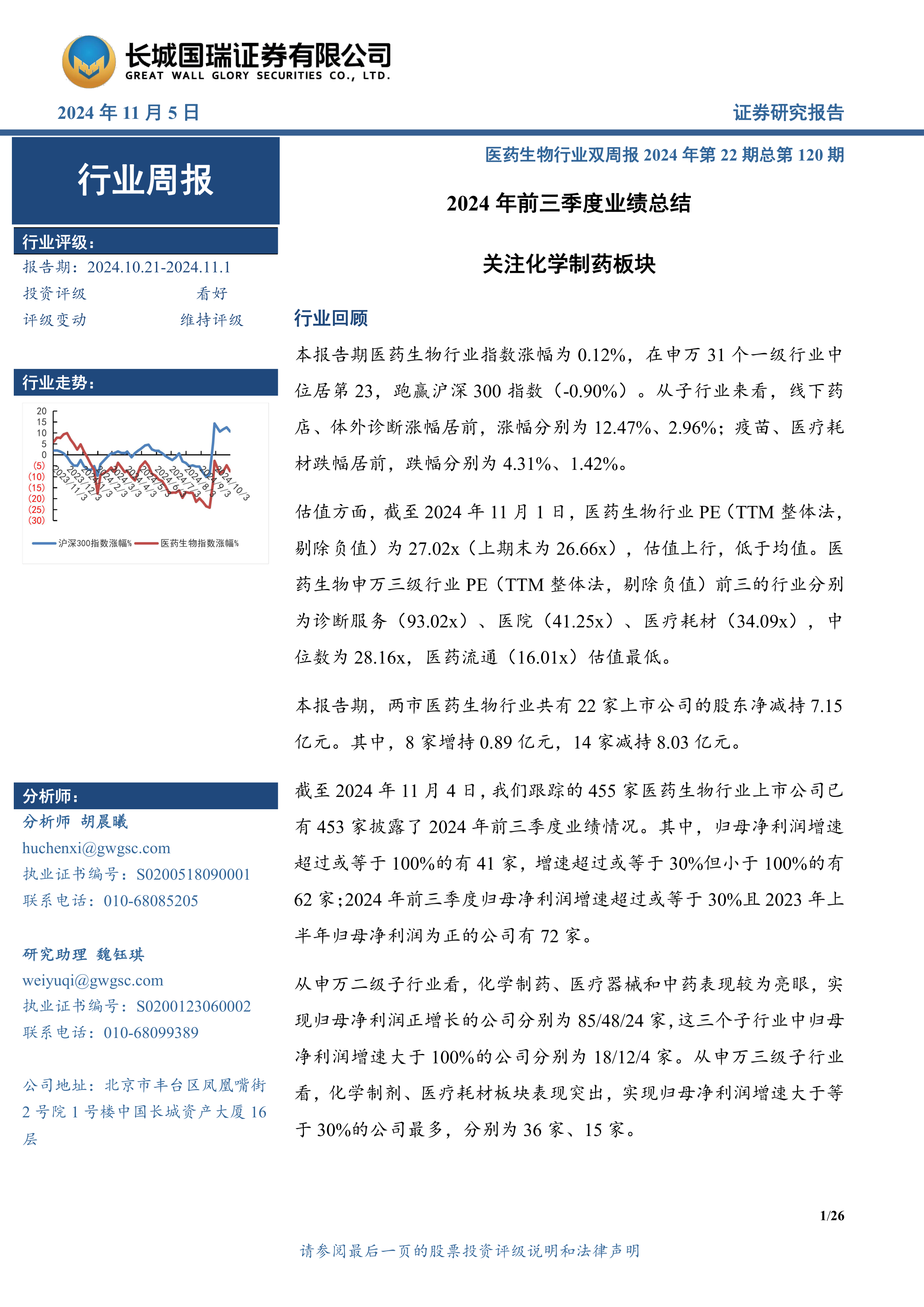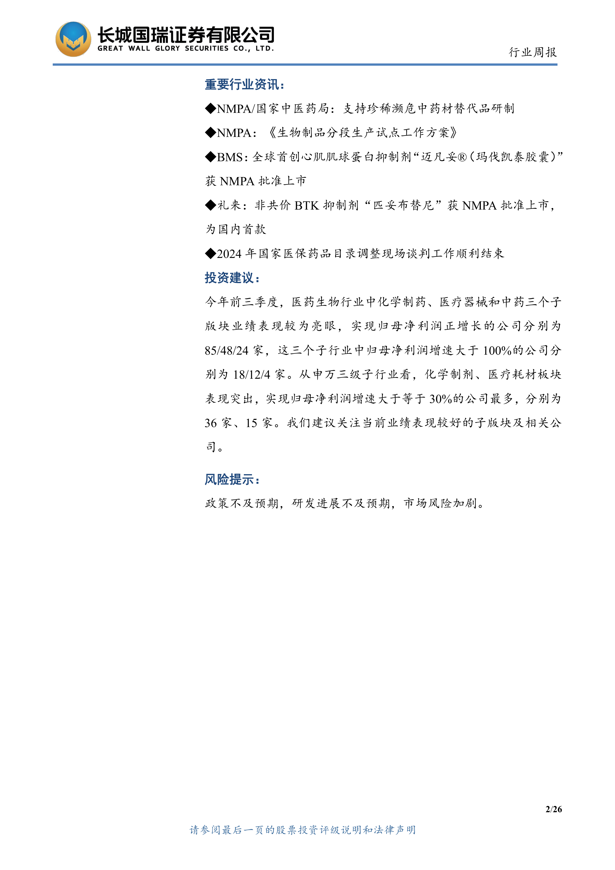本报告涵盖了医药生物行业2024年前三季度的市场行情回顾、重要行业资讯、公司动态以及投资建议等方面的内容。