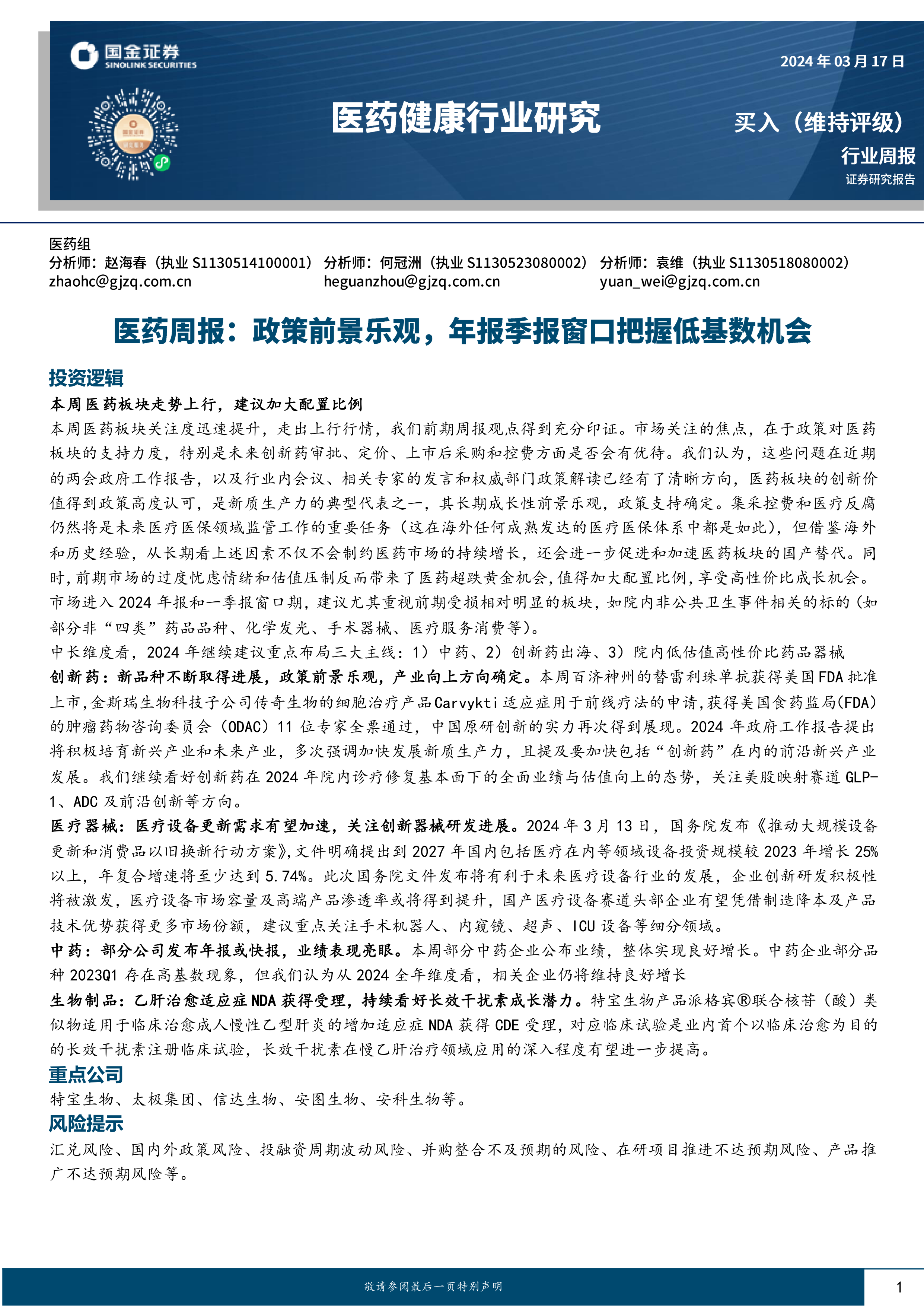 本周医药板块关注度迅速提升,走出上行行情,我们前期周报观点得到充分印证。市场关注的焦点,在于政策对医药板块的支持力度,特别是未来创新药审批、定价、上市后采购和控费方面是否会有优待。我们认为,这些问题在近期的两会政府工作报告,以及行业内会议、相关专家的发言和权威部门政策解读已经有了清晰方向,医药板块的创新价值得到政策高度认可,是新质生产力的典型代表之一,其长期成长性前景乐观,政策支持确定。集采控费和医疗反腐仍然将是未来医疗医保领域监管工作的重要任务(这在海外任何成熟发达的医疗医保体系中都是如此),但借鉴海外和历史经验,从长期看上述因素不仅不会制约医药市场的持续增长,还会进一步促进和加速医药板块的国产替代。同时,前期市场的过度忧虑情绪和估值压制反而带来了医药超跌黄金机会,值得加大配置比例,享受高性价比成长机会。市场进入2024年报和一季报窗口期,建议尤其重视前期受损相对明显的板块,如院内非公共卫生事件相关的标的(如部分非“四类”药品品种、化学发光、手术器械、医疗服务消费等)。