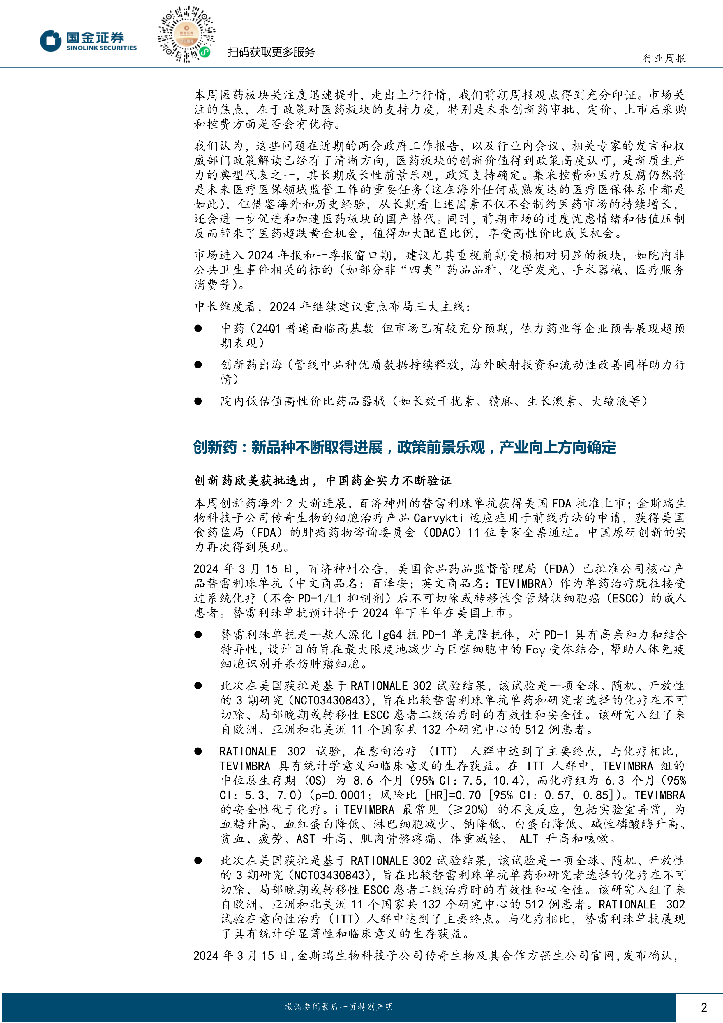 创新药:新品种不断取得进展,政策前景乐观,产业向上方向确定。本周百济神州的替雷利珠单抗获得美国FDA批准上市,金斯瑞生物科技子公司传奇生物的细胞治疗产品Carvykti适应症用于前线疗法的申请,获得美国食药监局(FDA)的肿瘤药物咨询委员会(ODAC)11位专家全票通过,中国原研创新的实力再次得到展现。2024年政府工作报告提出将积极培育新兴产业和未来产业,多次强调加快发展新质生产力,且提及要加快包括“创新药”在内的前沿新兴产业发展。我们继续看好创新药在2024年院内诊疗修复基本面下的全面业绩与估值向上的态势,关注美股映射赛道GLP-1、ADC及前沿创新等方向。