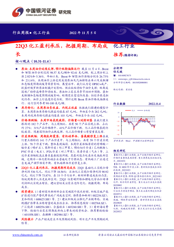 本报告的核心观点是:2022年第三季度化工行业盈利承压,主要原因是国际油价高位回落导致的原料库存转化损失,以及国内疫情反复影响下游需求恢复不及预期。 建议投资者把握周期,布局成长性企业,特别是关注国产替代的高端新材料领域和强化产业链布局的成长型企业。