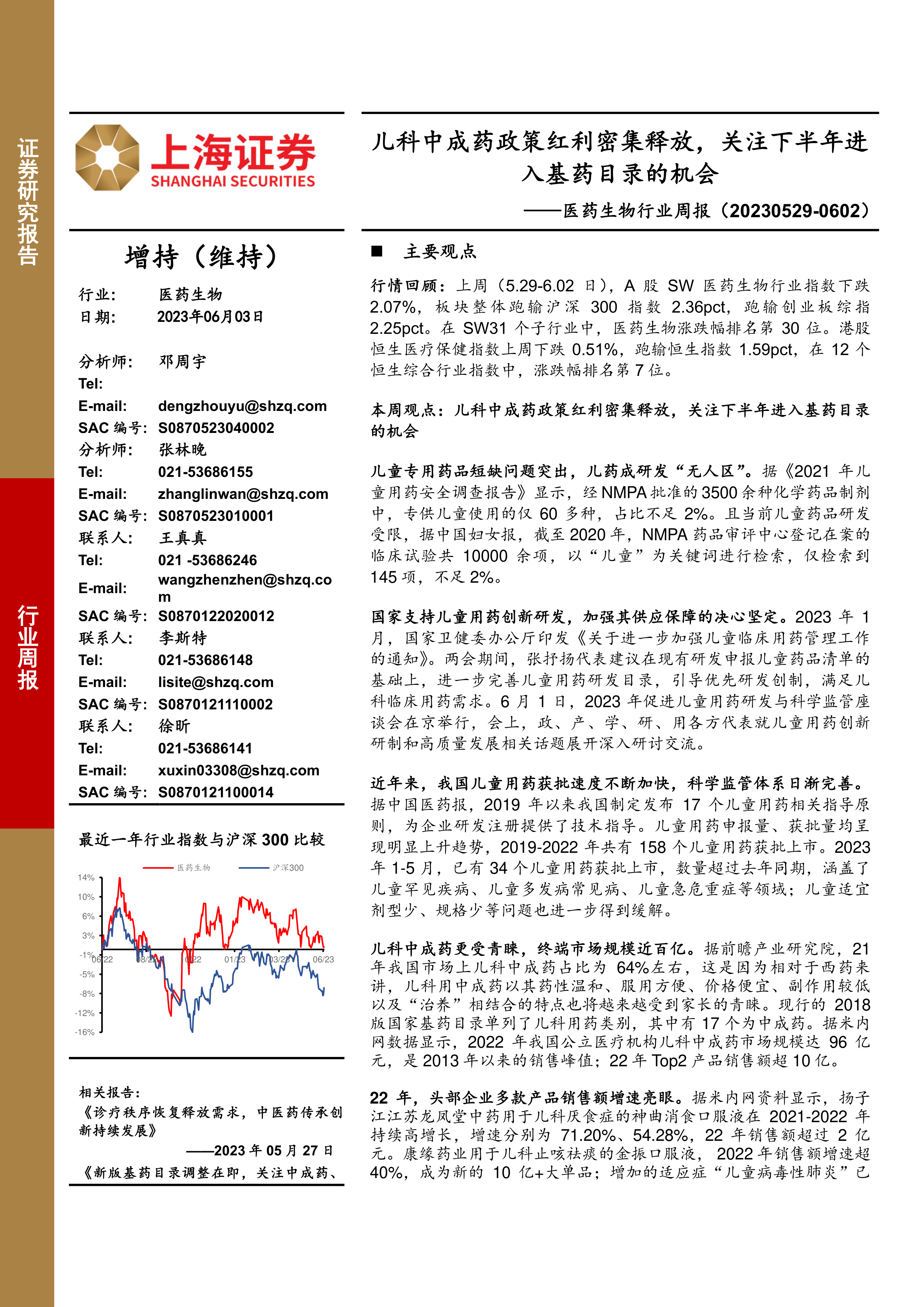 本周观点:儿科中成药政策红利密集释放,关注下半年进入基药目录的机会