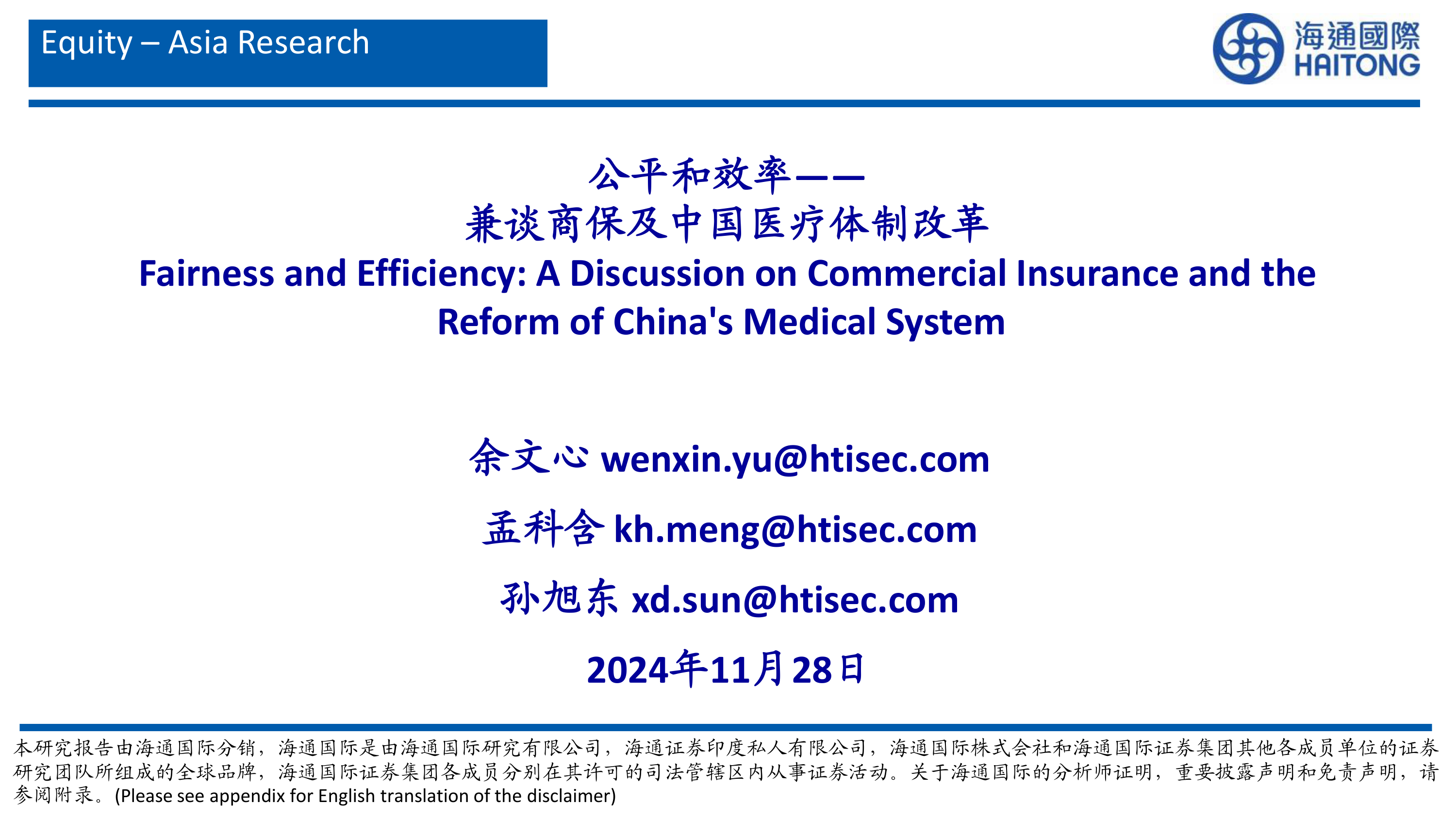 兼谈商保及中国医疗体制改革:公平和效率