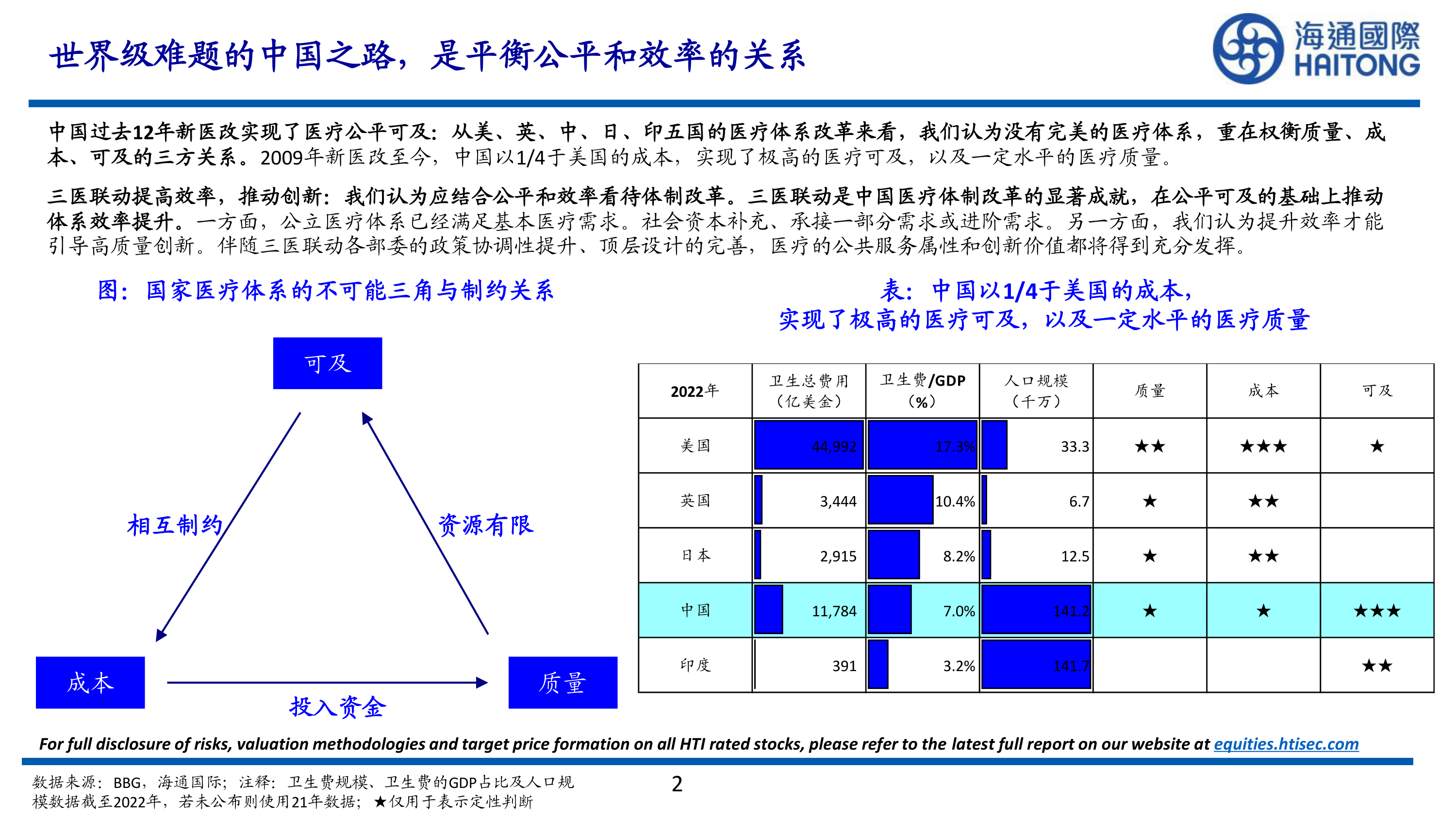 中国十二年医改以较低的成本实现了较高的医疗可及性,一定程度上提升了医疗质量,体现了对医疗公平的追求。然而,医疗资源有限,质量、成本、可及性之间存在“不可能三角”的制约关系。因此,医疗体制改革需要在公平与效率之间寻求平衡,而“三医联动”正是中国探索这一平衡的有效路径。
