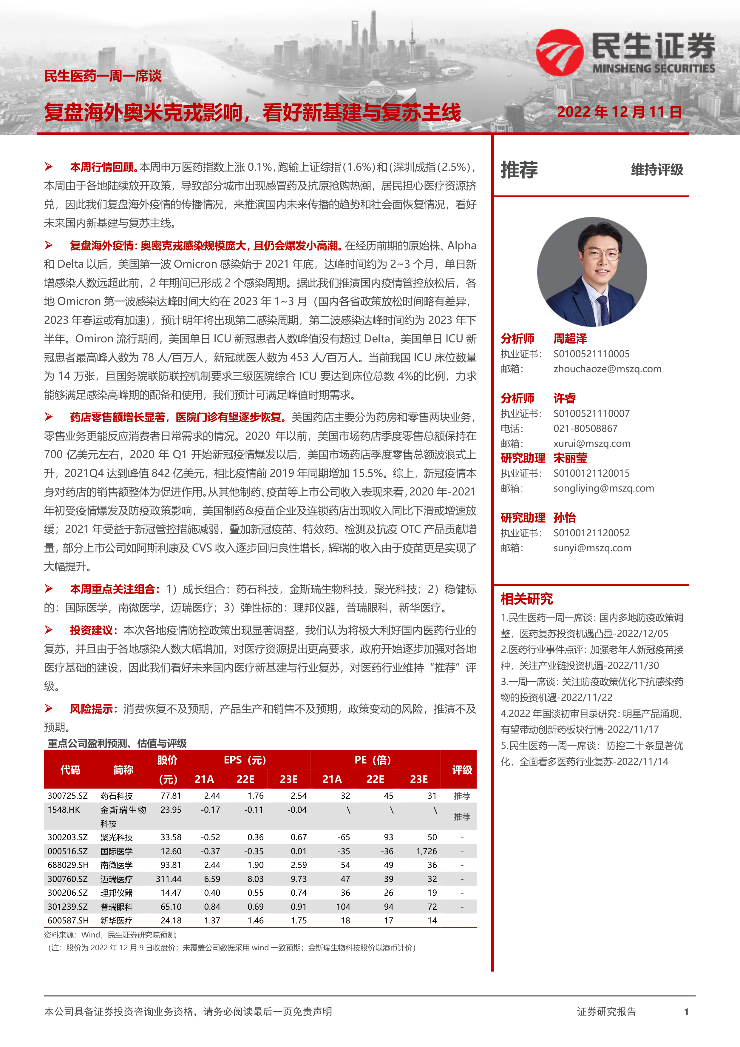 民生医药一周一席谈:复盘海外奥米克戎影响,看好新基建与复苏主线